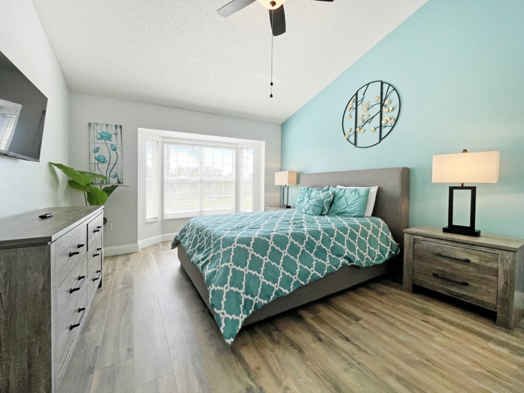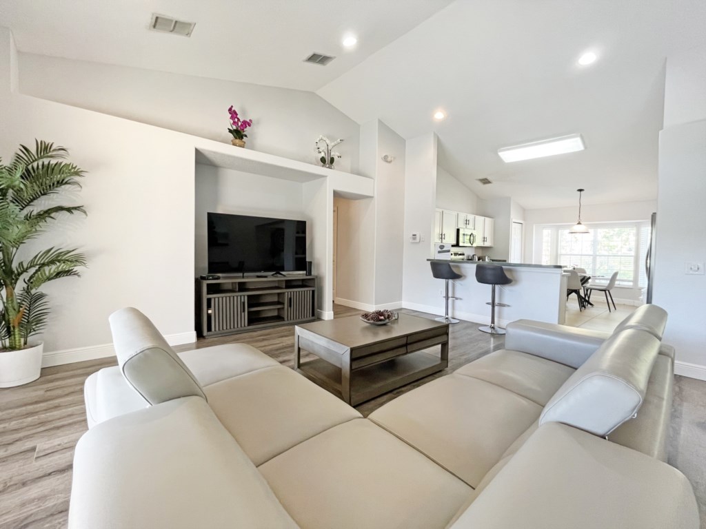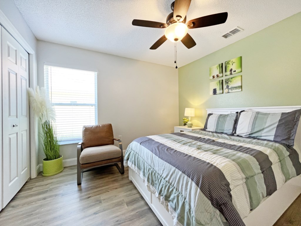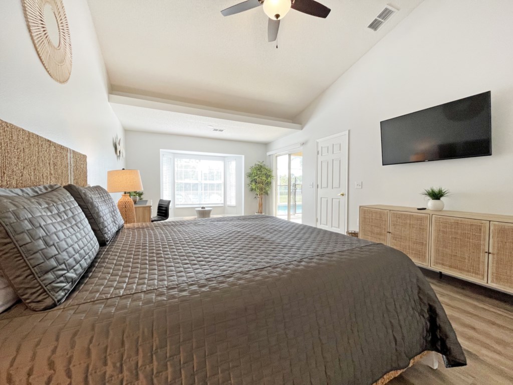 This private pool home has a conservation view from the front yard and a stunning lake view to the rear. The contemporary living area features a comfortable leather sofa and large screen TV. The kitchen is fully equipped, has stainless steel appliances, and granite worktops. There's a four seat breakfast nook and six seat formal dining table and chairs. The living area leads out to the screened-in deck facing west. The spacious master bedroom boasts a kingsize bed, walk-in closet and ensuite bathroom with double sinks and separate bath tub and shower. The bedroom also includes a desk and chair and sliding doors on to lanai. There are two other queen bedrooms that share a bathroom that is also accessible from the pool deck. Outside there is a covered area with a patio table and chairs and the lakeside location ensures a serene and private place to enjoy the pool and stunning sunsets.