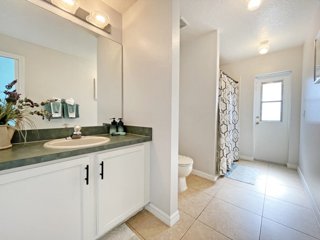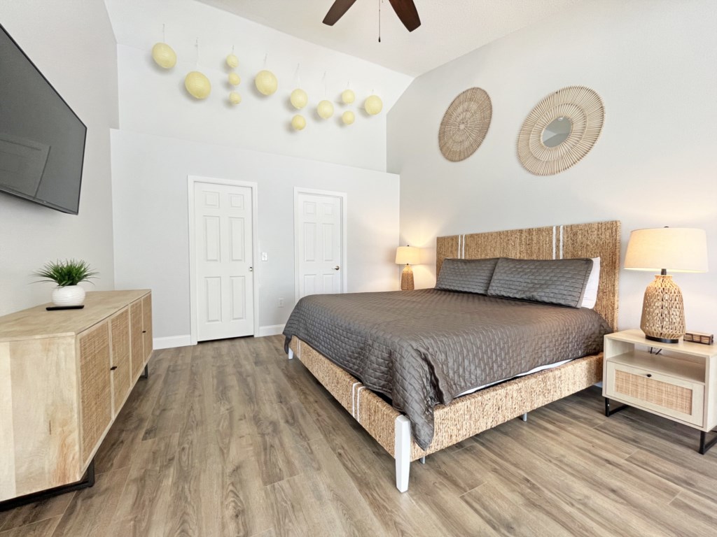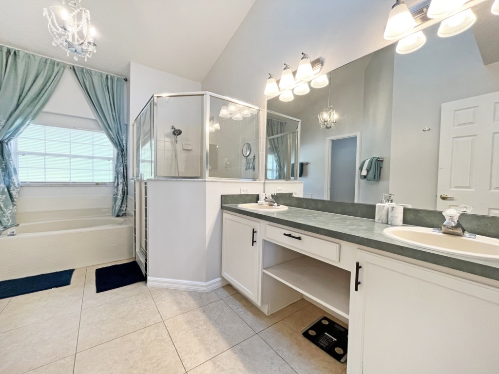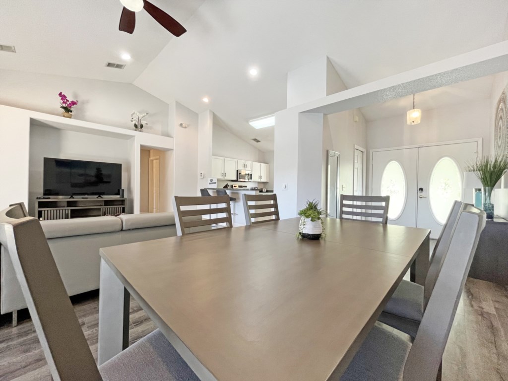 This private pool home has a conservation view from the front yard and a stunning lake view to the rear. The contemporary living area features a comfortable leather sofa and large screen TV. The kitchen is fully equipped, has stainless steel appliances, and granite worktops. There's a four seat breakfast nook and six seat formal dining table and chairs. The living area leads out to the screened-in deck facing west. The spacious master bedroom boasts a kingsize bed, walk-in closet and ensuite bathroom with double sinks and separate bath tub and shower. The bedroom also includes a desk and chair and sliding doors on to lanai. There are two other queen bedrooms that share a bathroom that is also accessible from the pool deck. Outside there is a covered area with a patio table and chairs and the lakeside location ensures a serene and private place to enjoy the pool and stunning sunsets.
