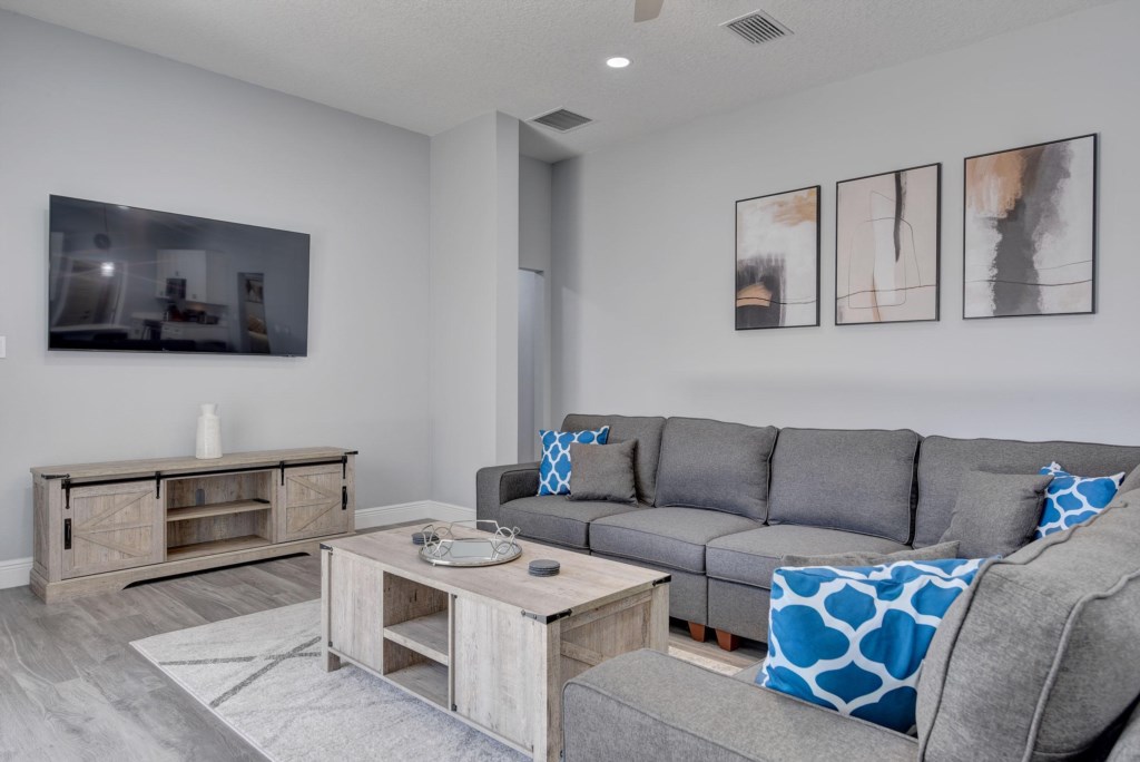 Large L-shaped sofa with wall mounted flat screen smart TV
