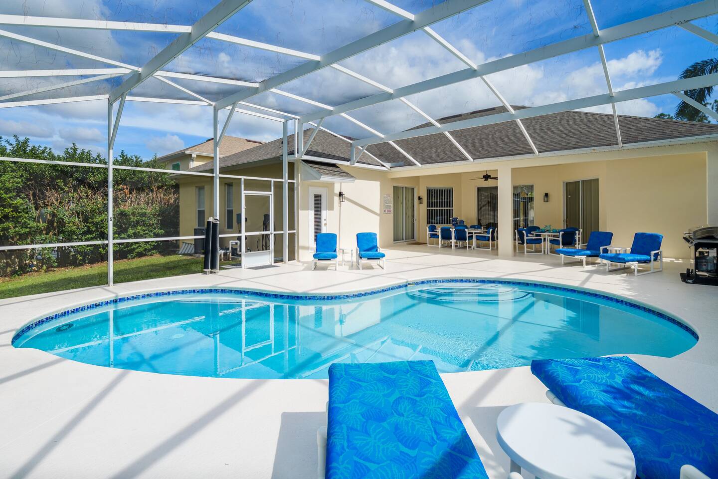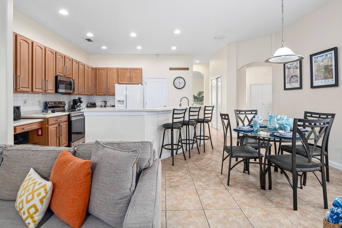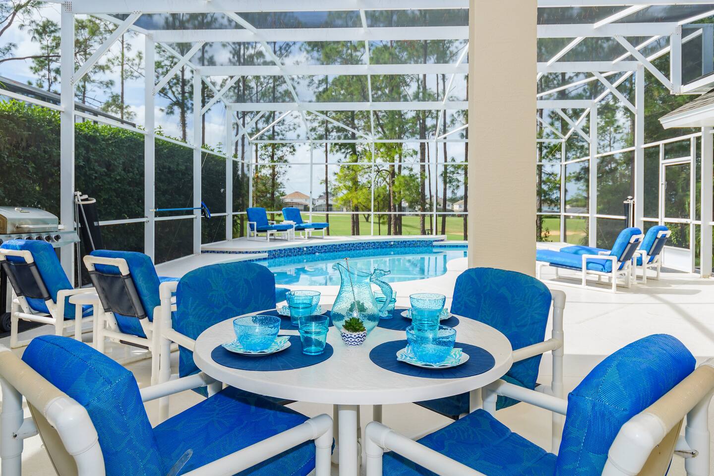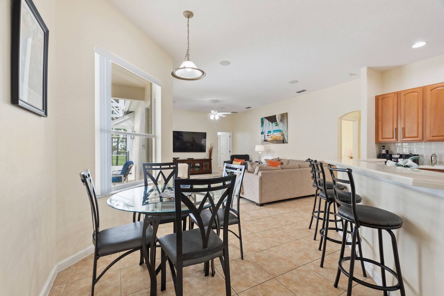 This luxury 5 bedroom 3 bathroom villa with 2 master bedrooms is perfect for two families sharing with plenty of space for everyone to spread out. Features include enviable golf course views, over sized private west facing pool deck with lanai, free internet connection, and a games room. As you step in through the impressive glass panelled front door of this fabulous villa you are greeted with a beautifully tiled entrance foyer with the first of two living rooms in front of you. Patio doors lead out to the pool deck. Walk through to the airy open plan kitchen, breakfast nook and large family room. This room is perfect as a place to socialize, watch the large LCD TV or relax and look out onto the swimming pool.
