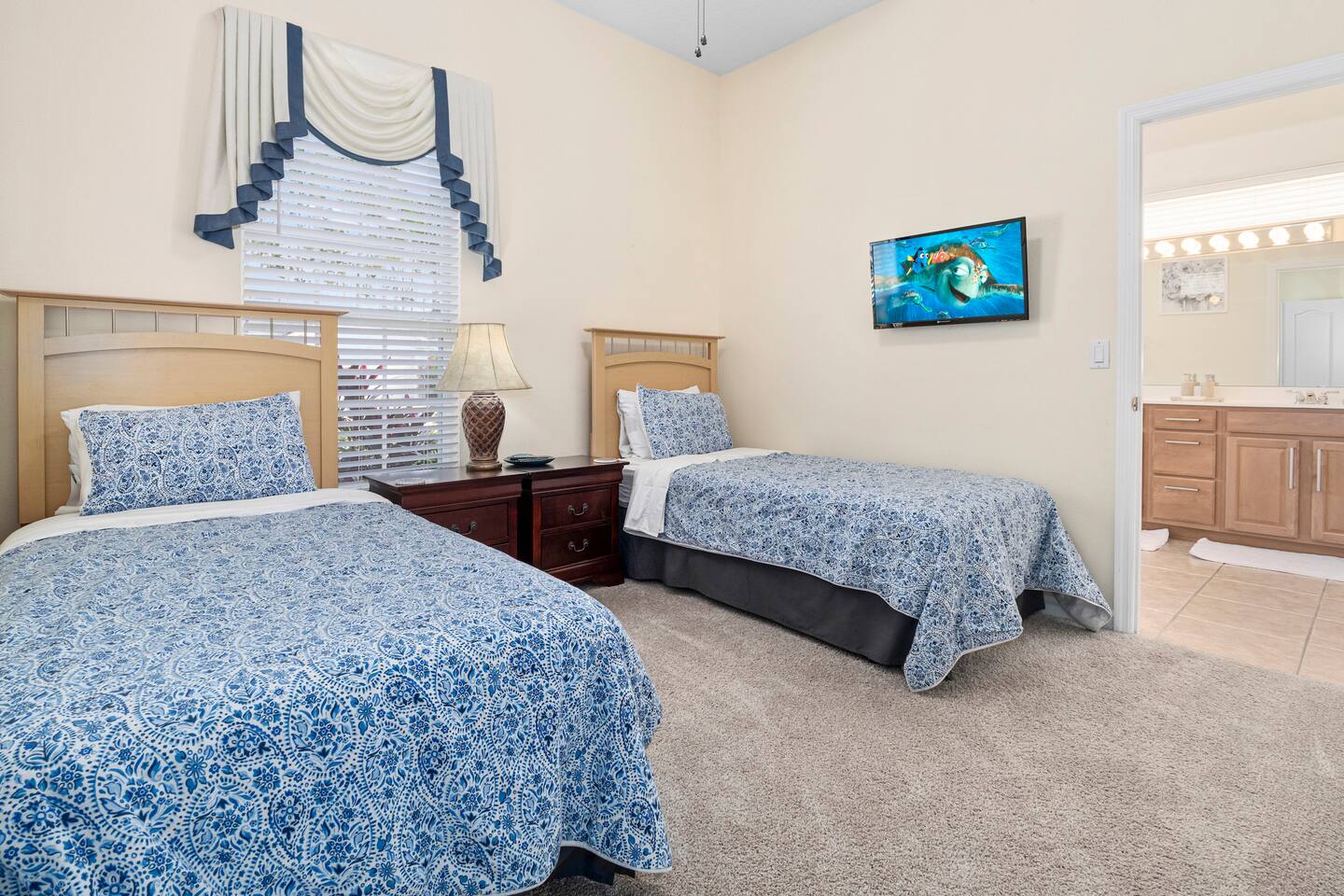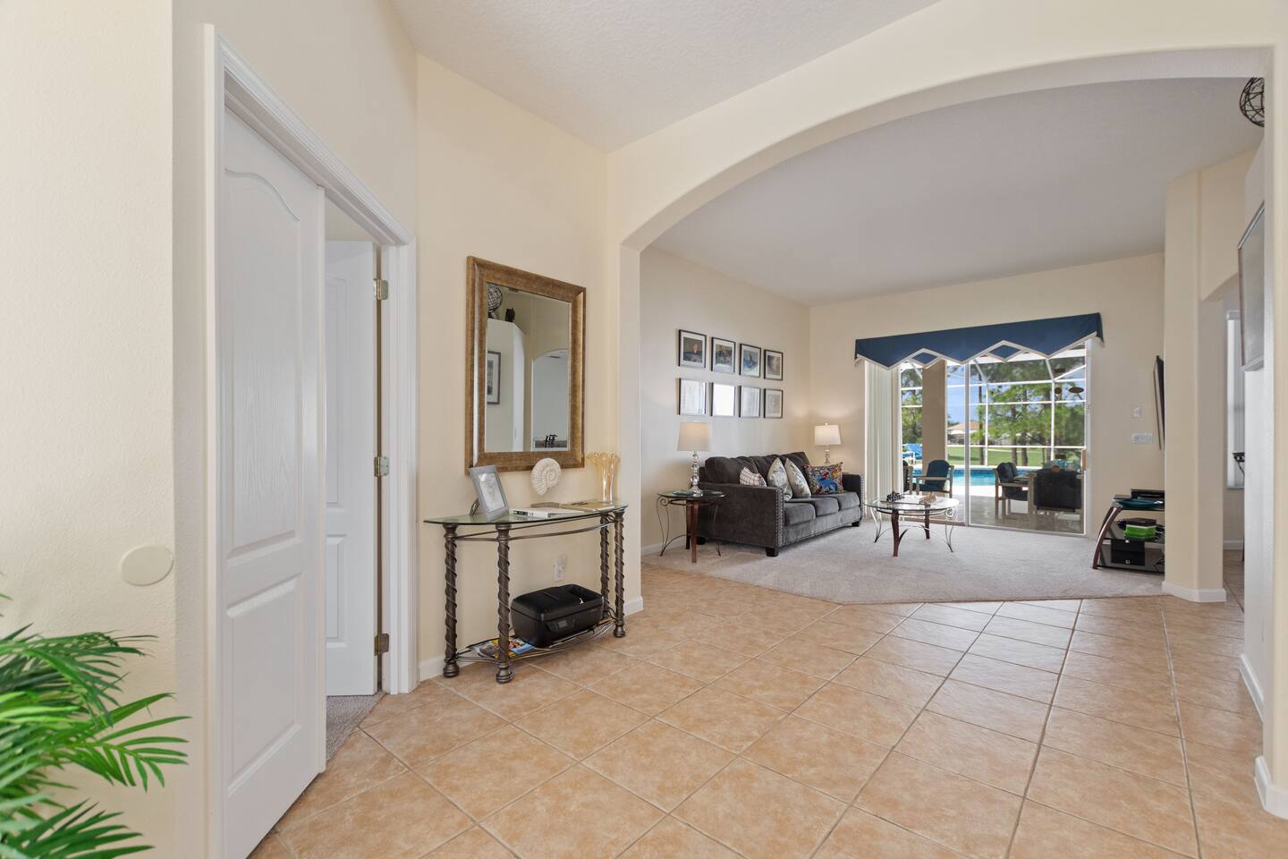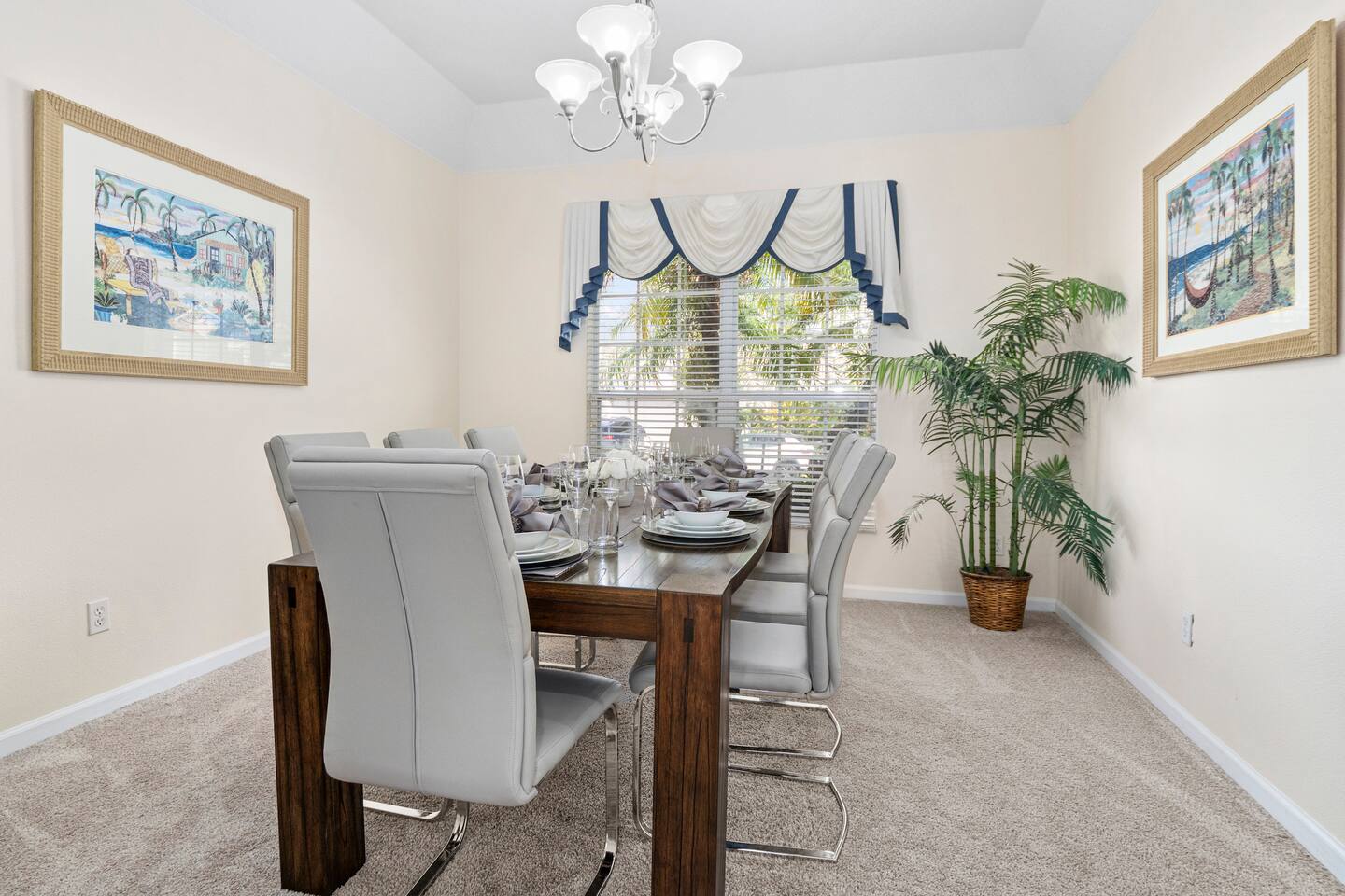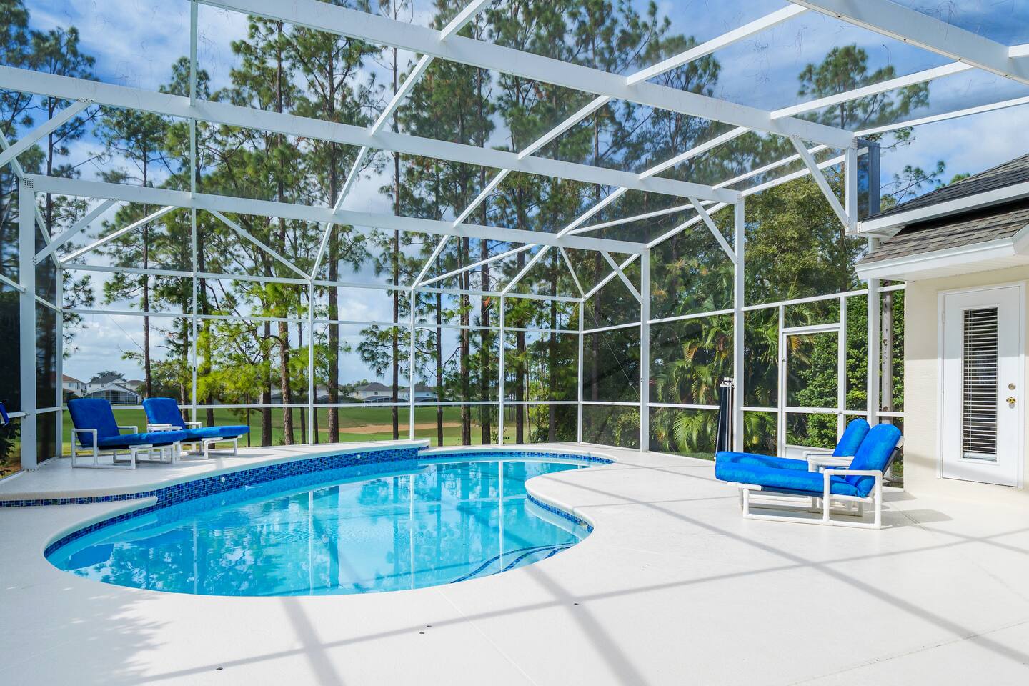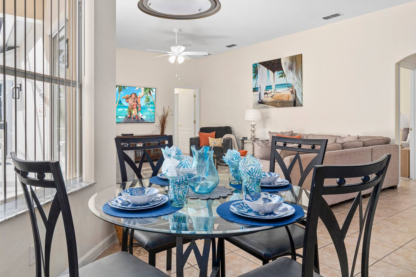 This luxury 5 bedroom 3 bathroom villa with 2 master bedrooms is perfect for two families sharing with plenty of space for everyone to spread out. Features include enviable golf course views, over sized private west facing pool deck with lanai, free internet connection, and a games room. As you step in through the impressive glass panelled front door of this fabulous villa you are greeted with a beautifully tiled entrance foyer with the first of two living rooms in front of you. Patio doors lead out to the pool deck. Walk through to the airy open plan kitchen, breakfast nook and large family room. This room is perfect as a place to socialize, watch the large LCD TV or relax and look out onto the swimming pool.