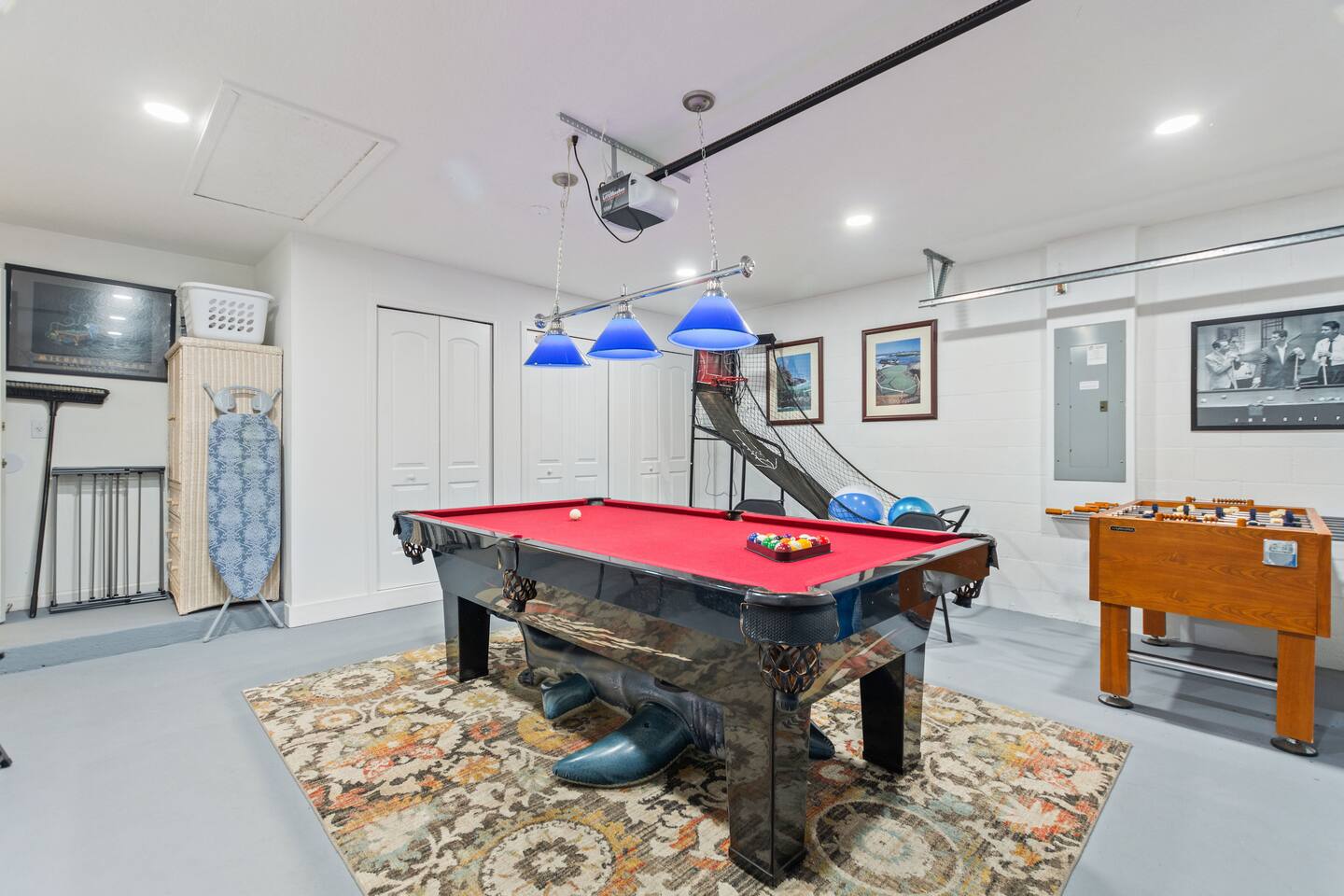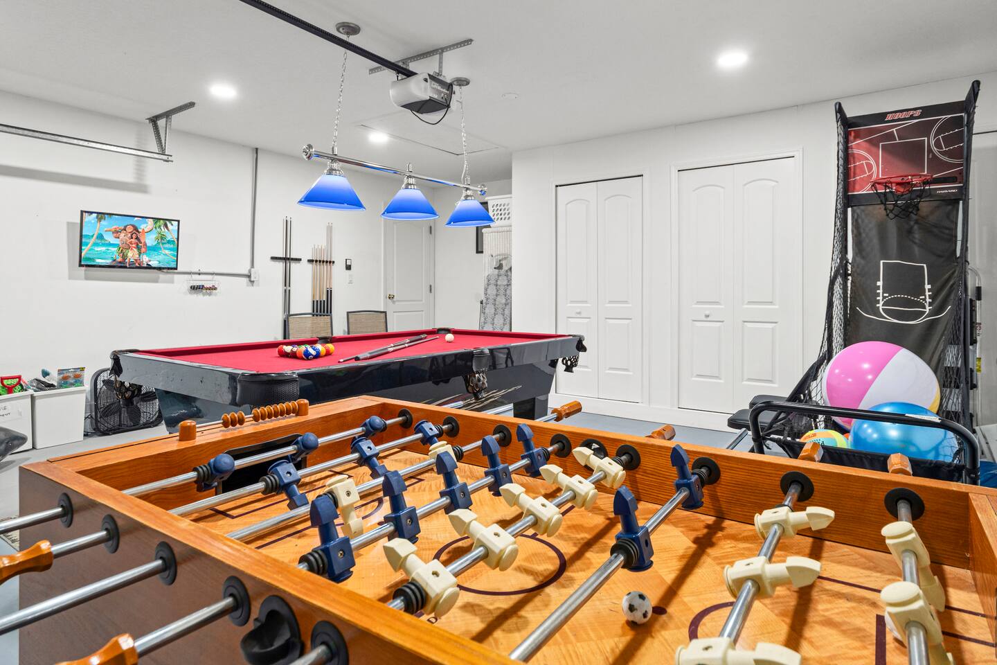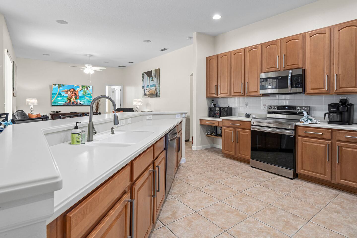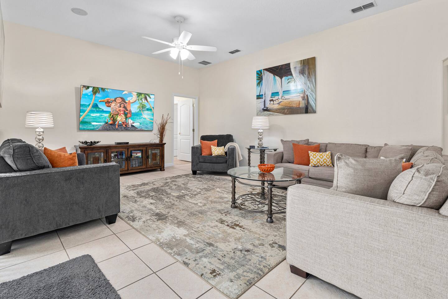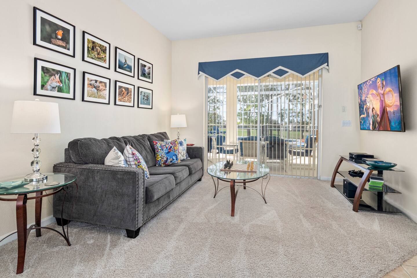 Open plan area next to the kitchen with loads of comfy seating, a large flat screen smart TV, and sliding patio doors that lead directly onto the pool deck