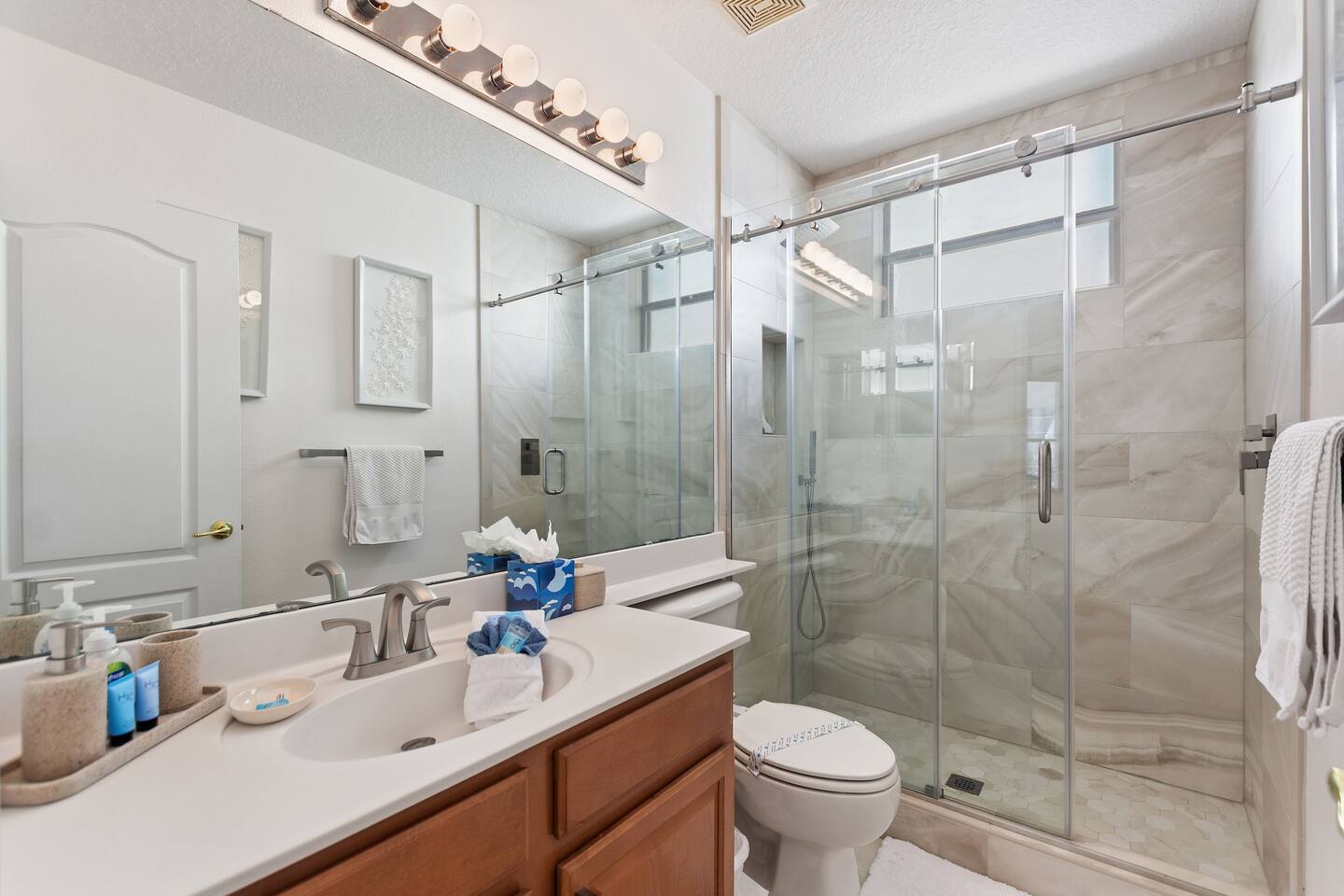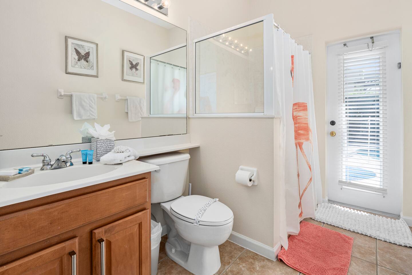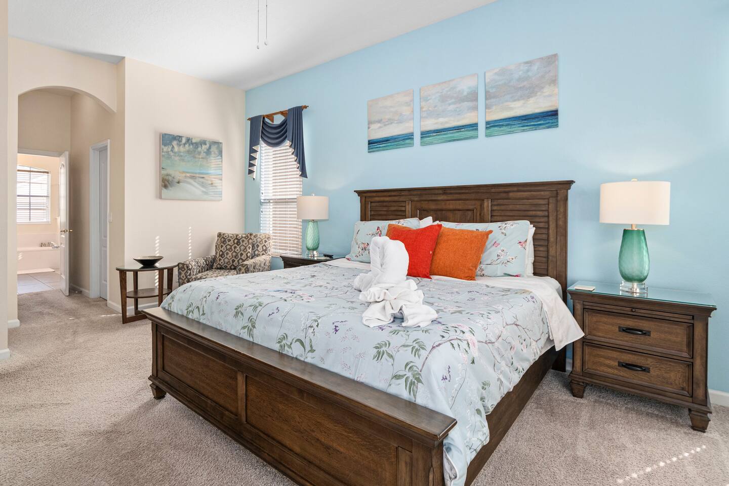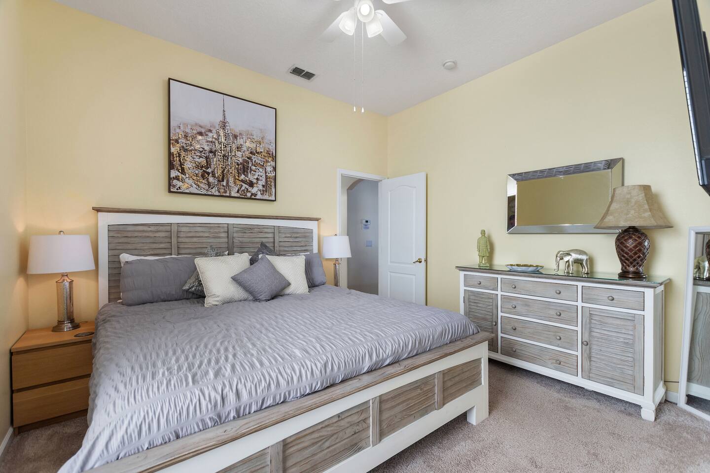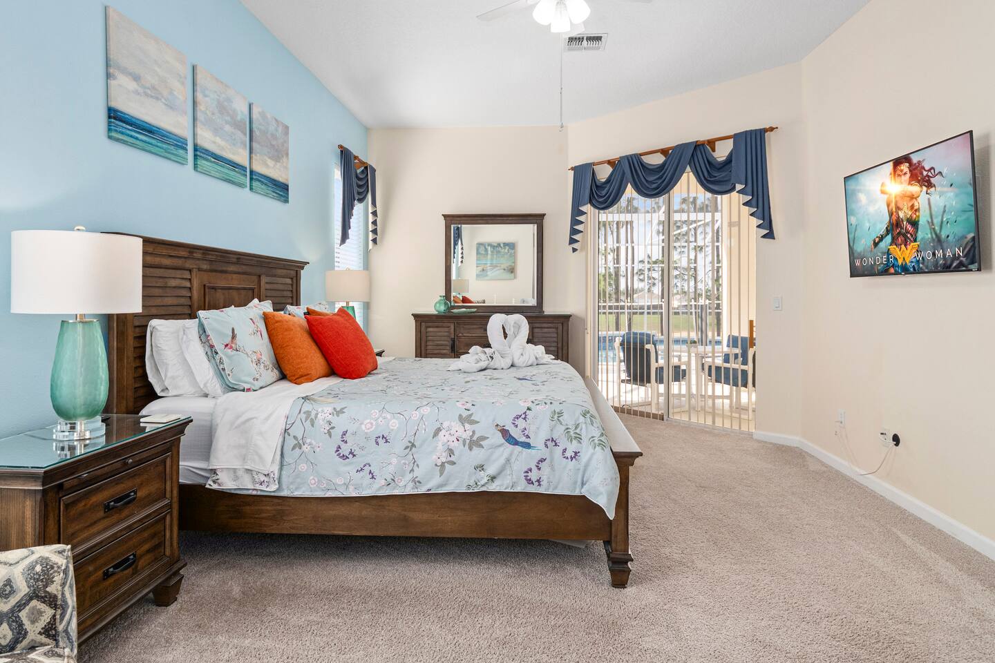 King size bed with views onto the pool deck. The en-suite for this bedroom doubles as the cabana bathroom