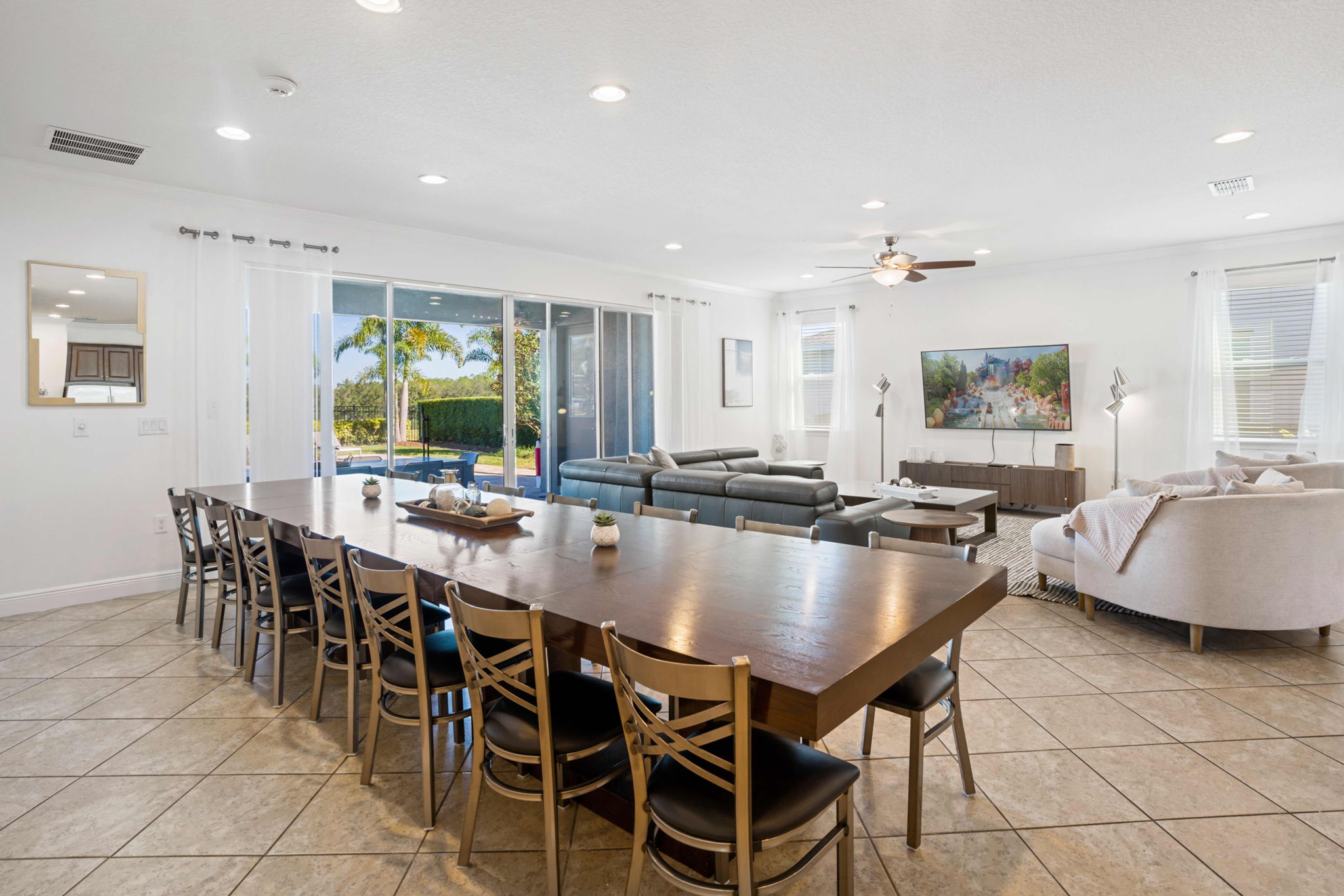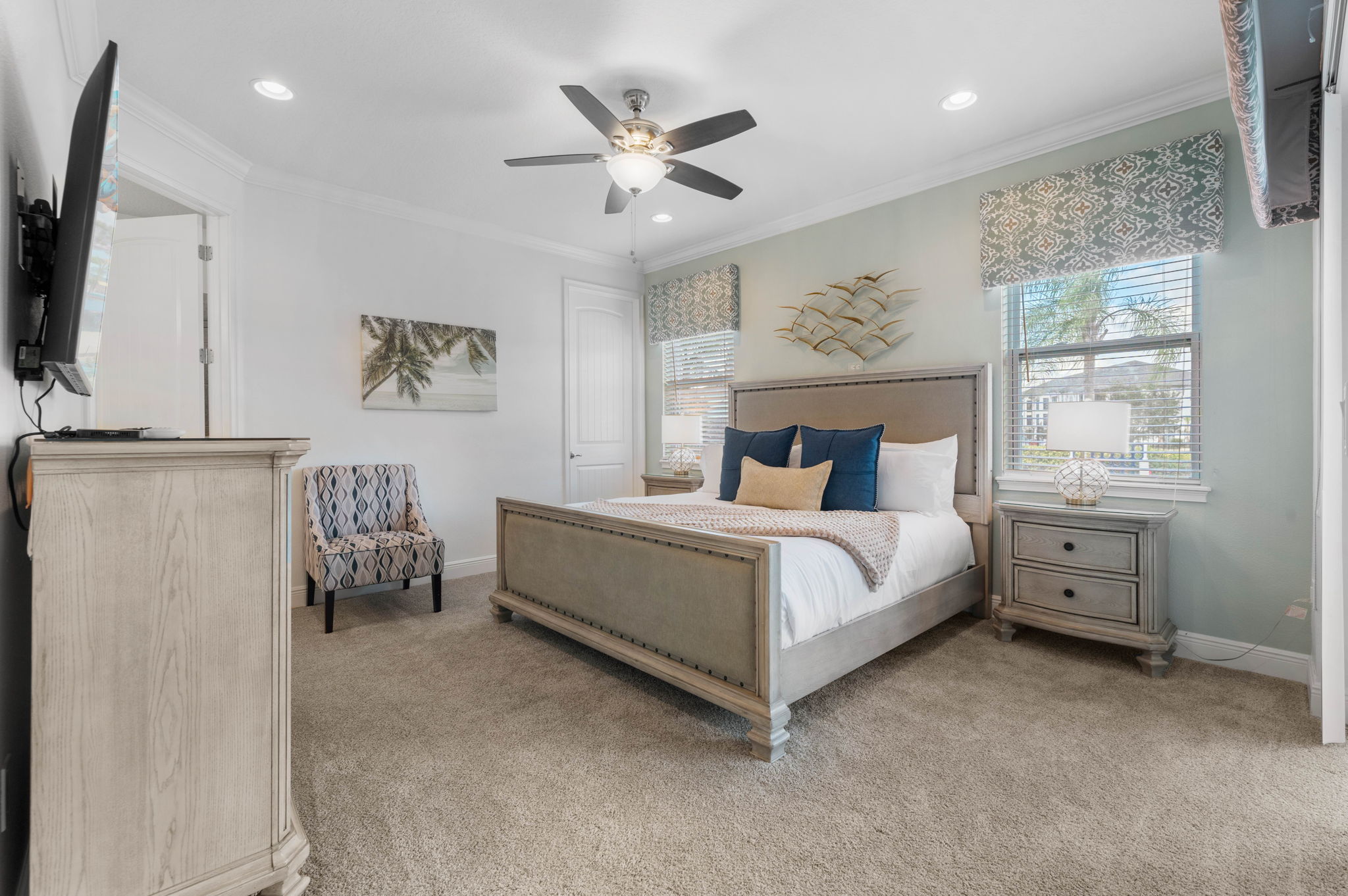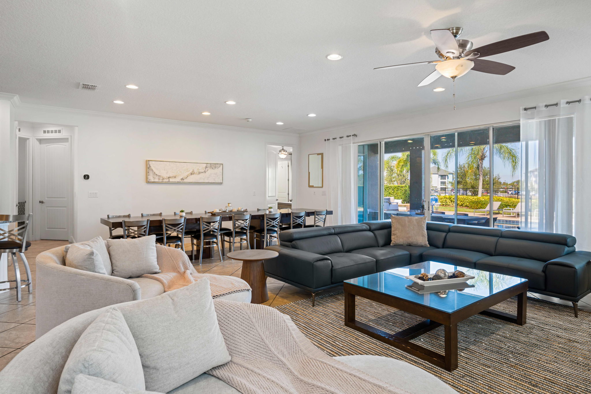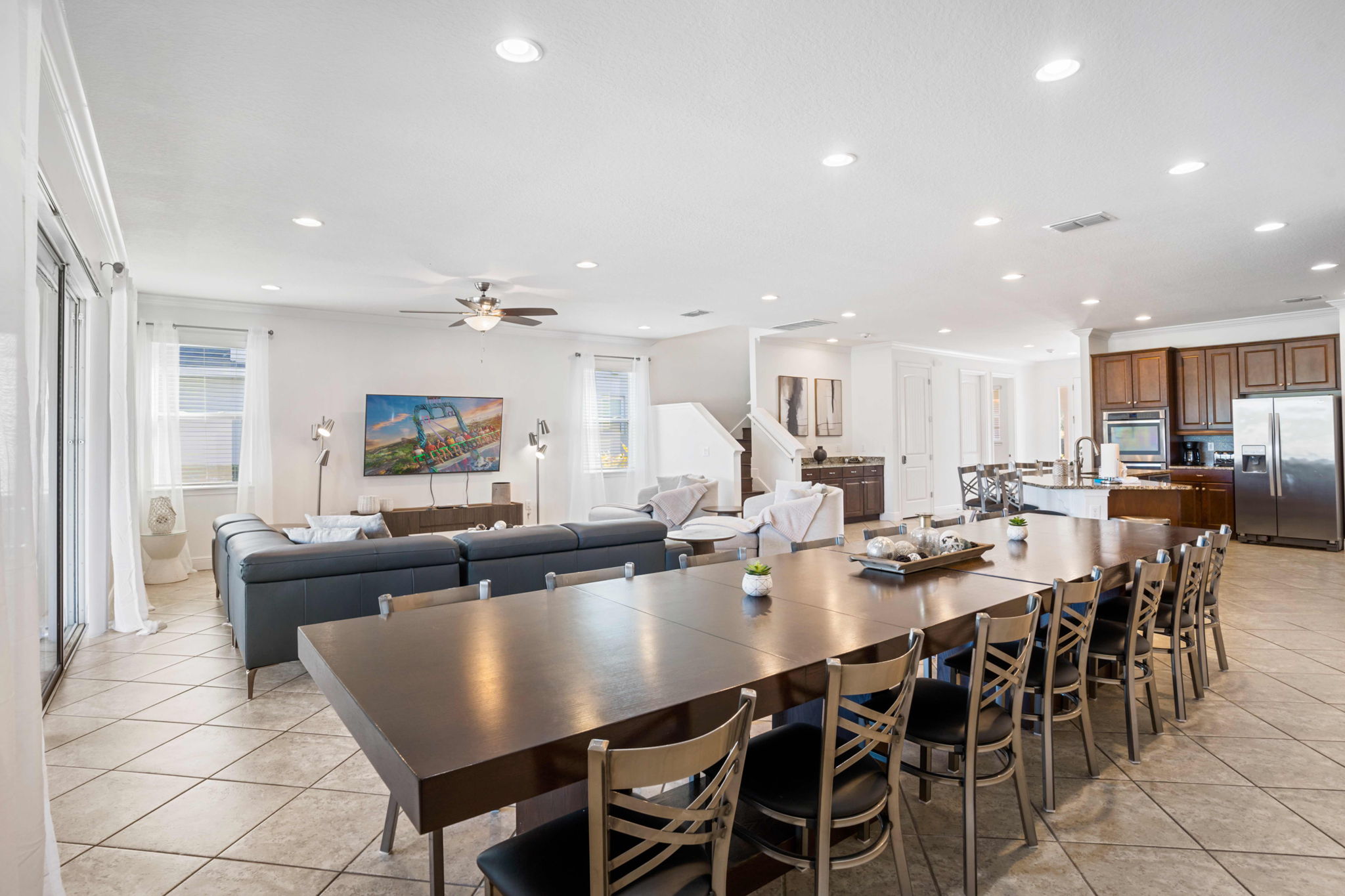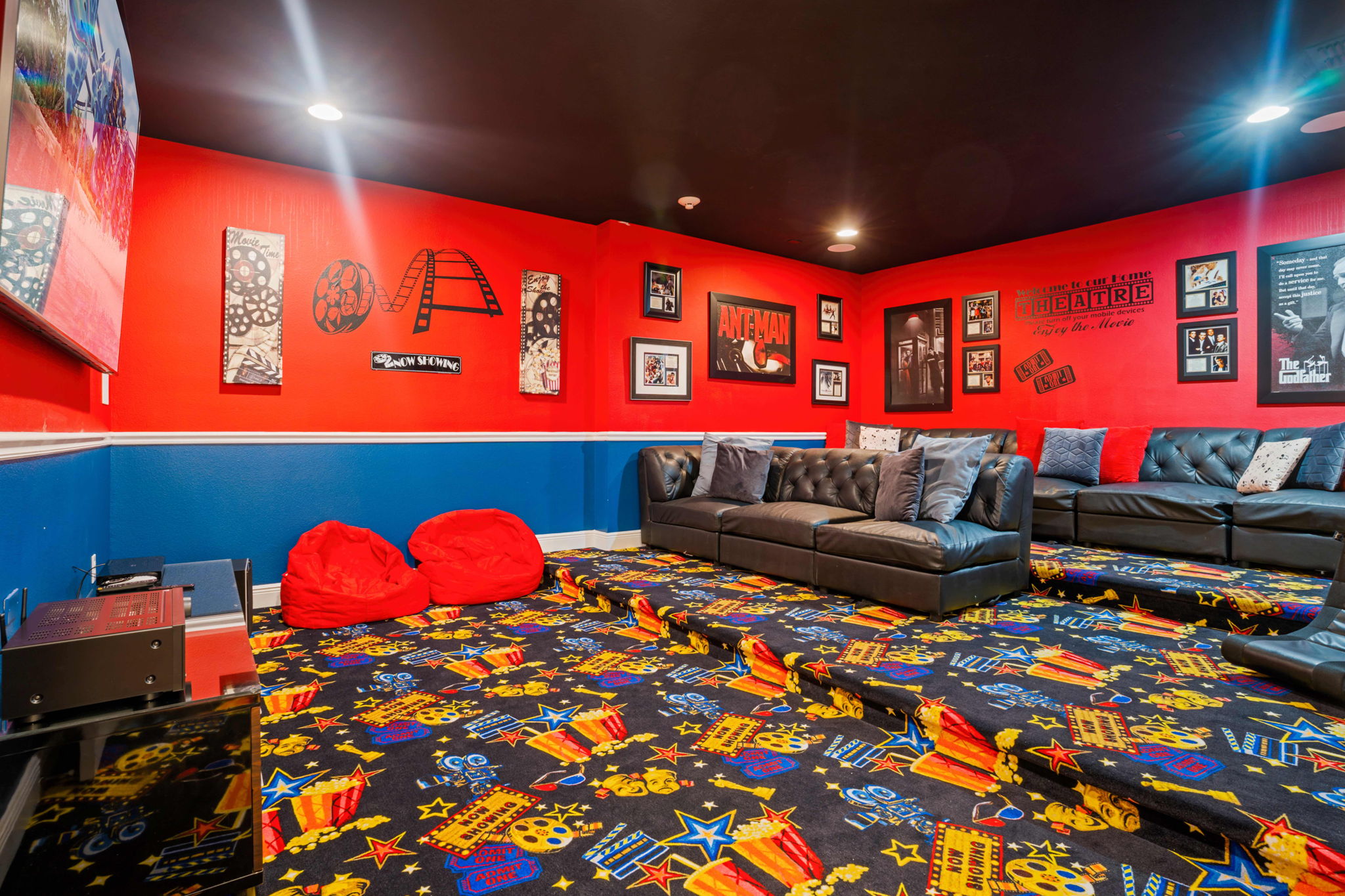 A fabulous, spacious 11 bedroom luxury villa that sleeps 22 people, perfectly suited for multiple families sharing or large family get togethers. Located in one of Orlando's premier resorts close to Disney, this beautiful home occupies a large lot providing privacy and space for outdoor games and relaxation. This substantial home enjoys open plan kitchen dining and seating area on the ground floor. The kitchen is fully equipped with everything you'd need, stainless steel appliances and marble counter tops. The dining table can accommodate up to 14 people, and a large L shaped sofa and armchairs with a wall mounted TV are next to large glass sliding doors that lead out to the pool deck. Upstairs, a large loft room with kitchenette, Pool table, bar area, drinks fridge and TV with X Box provide an alternative space for adults or children to hang out. There's also a separate cinema room has stepped seating and a large screen with projector for that movie night in. There is a games room in the converted garage which features a basketball game, foosball and a ping pong table. With four king sized ensuite bedrooms on the ground floor, and upstairs, two king ensuite bedrooms, a king bedroom, a queen bedroom, a twin and full ensuite bedroom, a twin full bed ensuite bedroom, and a twin bunk ensuite bedroom. Resort amenities, including water park access, are NOT available for stays at this house. However, you can still visit the clubhouse's restaurant, bar and gift shop.
