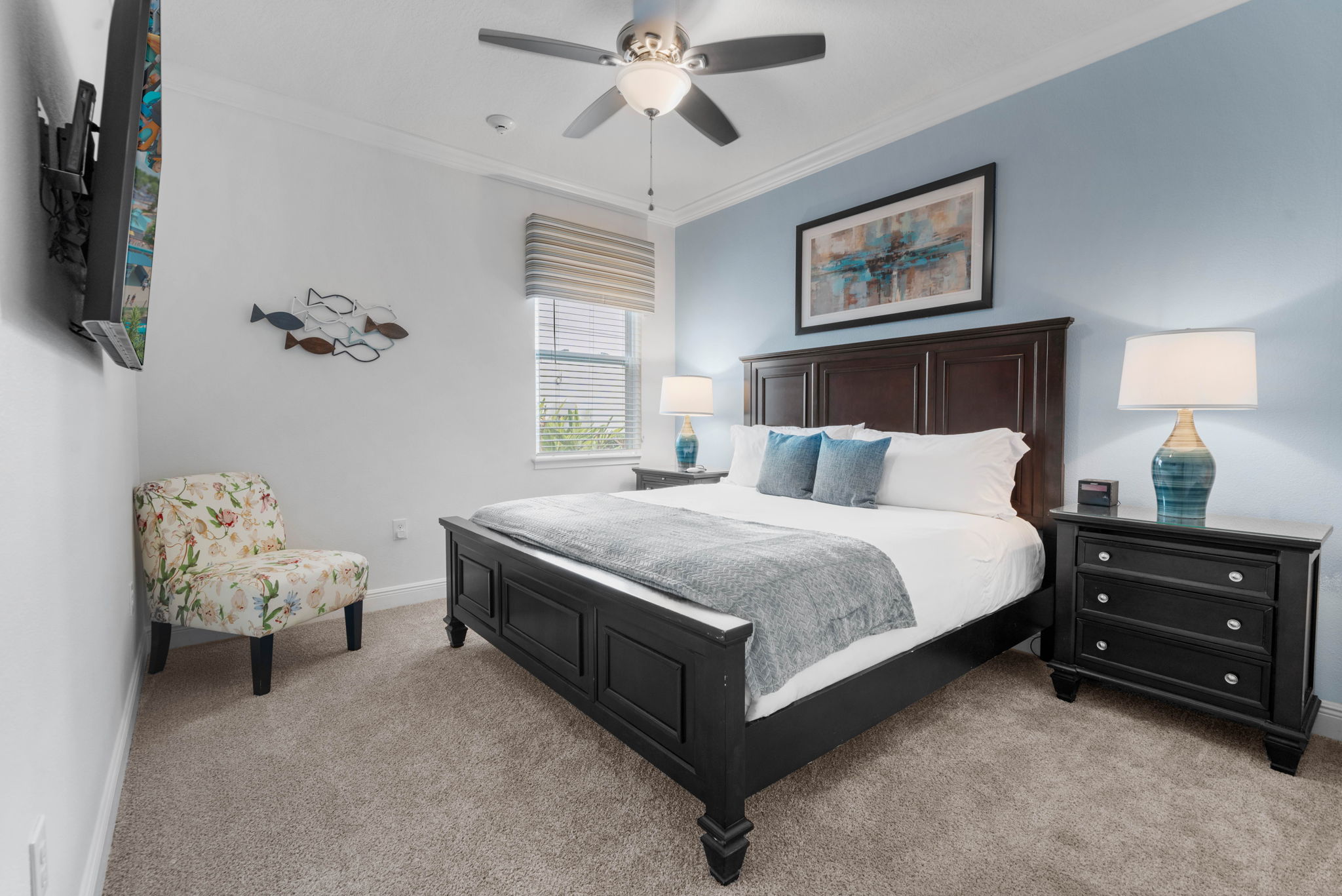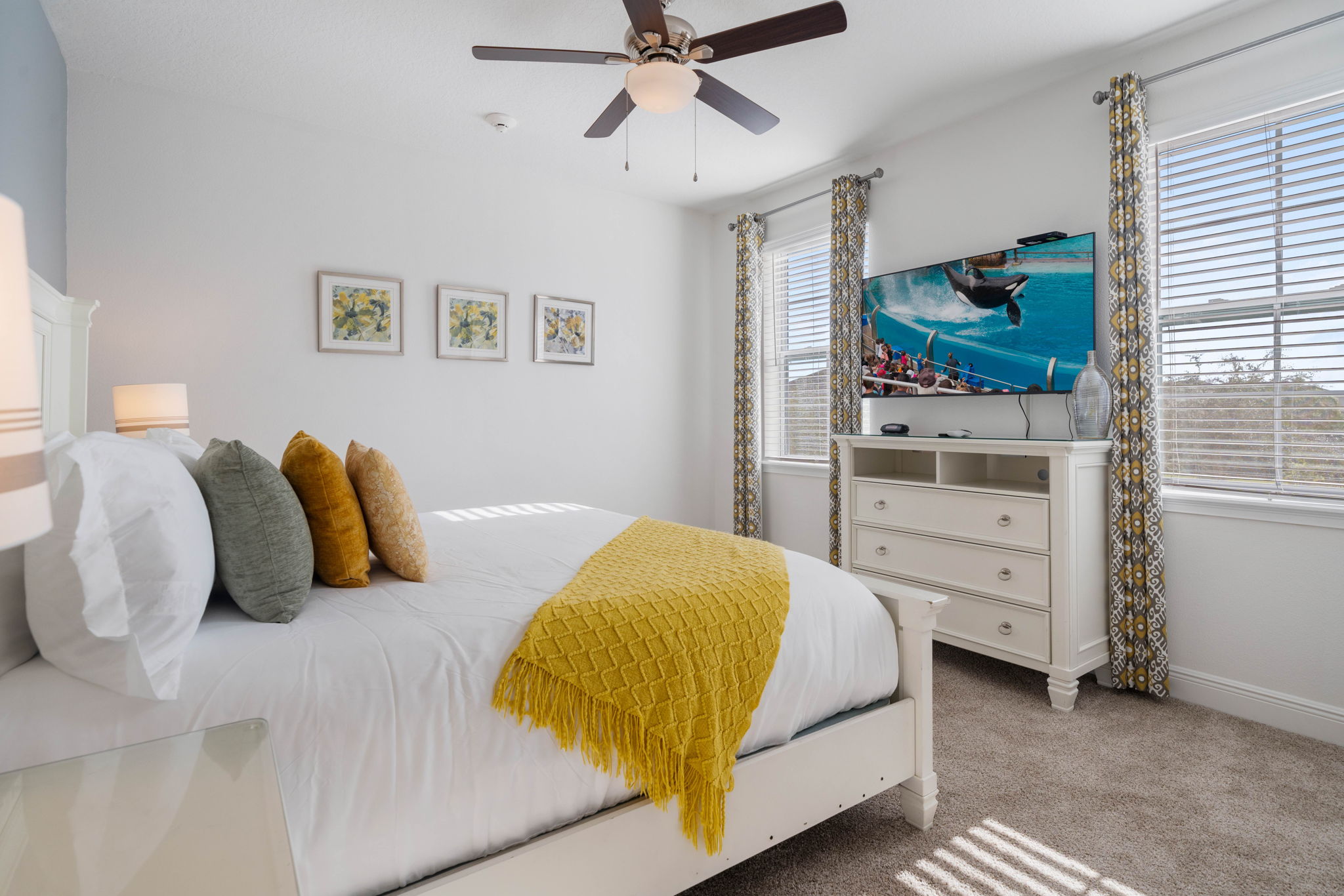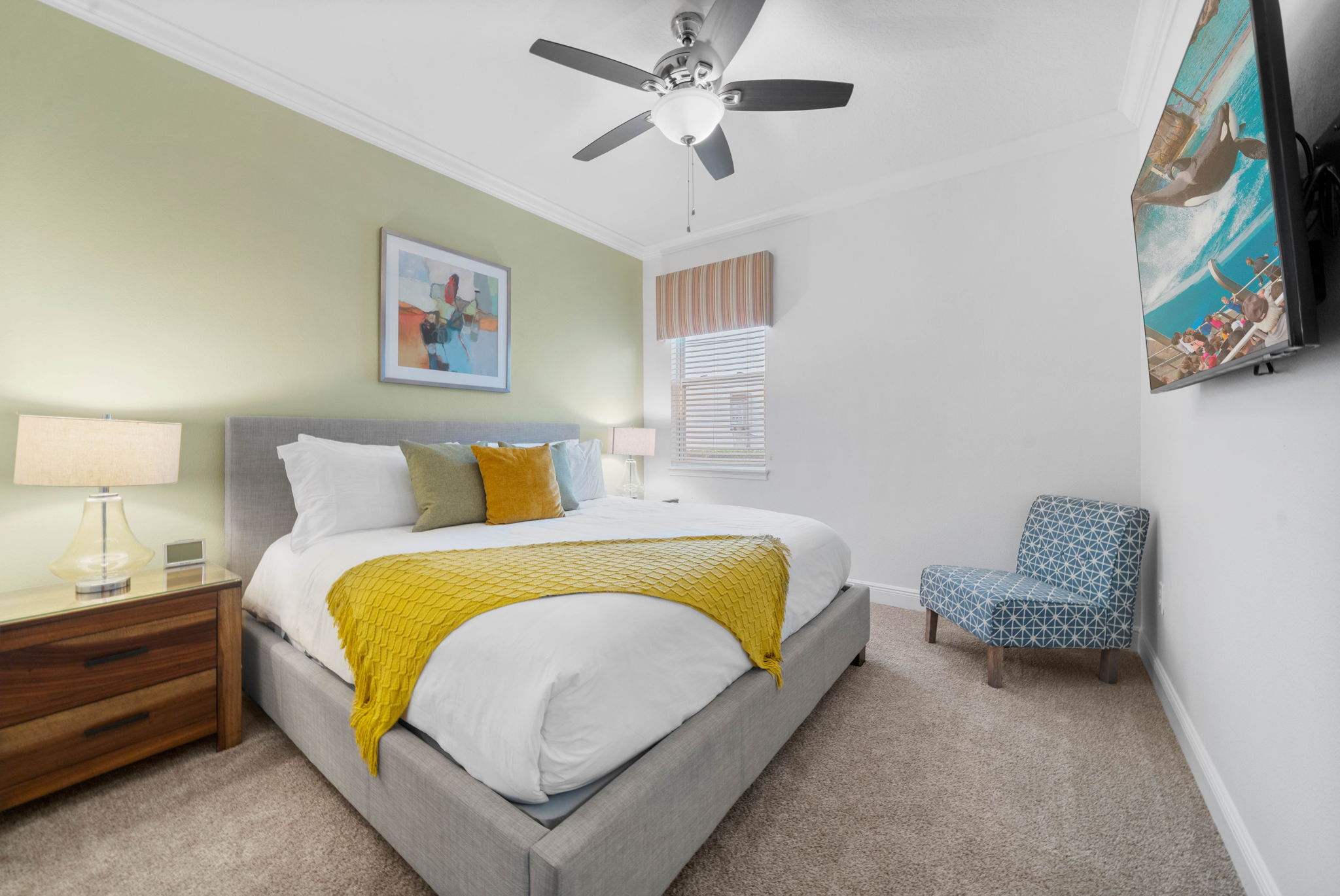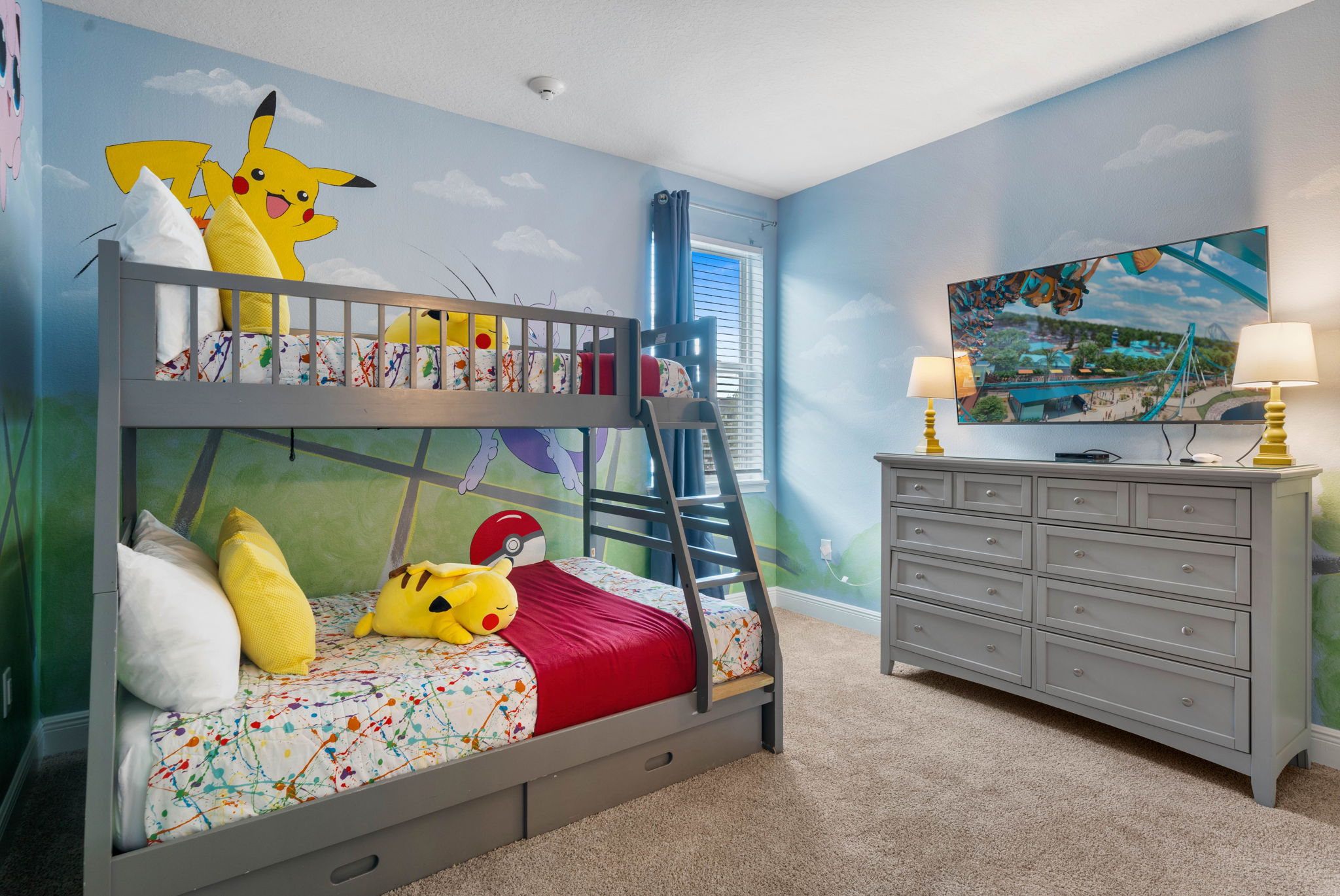 A fabulous, spacious 11 bedroom luxury villa that sleeps 22 people, perfectly suited for multiple families sharing or large family get togethers. Located in one of Orlando's premier resorts close to Disney, this beautiful home occupies a large lot providing privacy and space for outdoor games and relaxation. This substantial home enjoys open plan kitchen dining and seating area on the ground floor. The kitchen is fully equipped with everything you'd need, stainless steel appliances and marble counter tops. The dining table can accommodate up to 14 people, and a large L shaped sofa and armchairs with a wall mounted TV are next to large glass sliding doors that lead out to the pool deck. Upstairs, a large loft room with kitchenette, Pool table, bar area, drinks fridge and TV with X Box provide an alternative space for adults or children to hang out. There's also a separate cinema room has stepped seating and a large screen with projector for that movie night in. There is a games room in the converted garage which features a basketball game, foosball and a ping pong table. With four king sized ensuite bedrooms on the ground floor, and upstairs, two king ensuite bedrooms, a king bedroom, a queen bedroom, a twin and full ensuite bedroom, a twin full bed ensuite bedroom, and a twin bunk ensuite bedroom. Resort amenities, including water park access, are NOT available for stays at this house. However, you can still visit the clubhouse's restaurant, bar and gift shop.