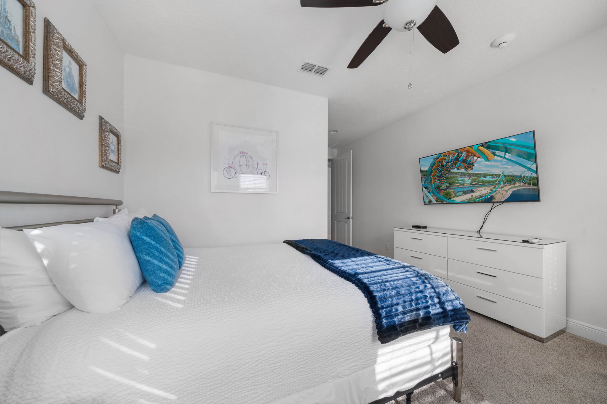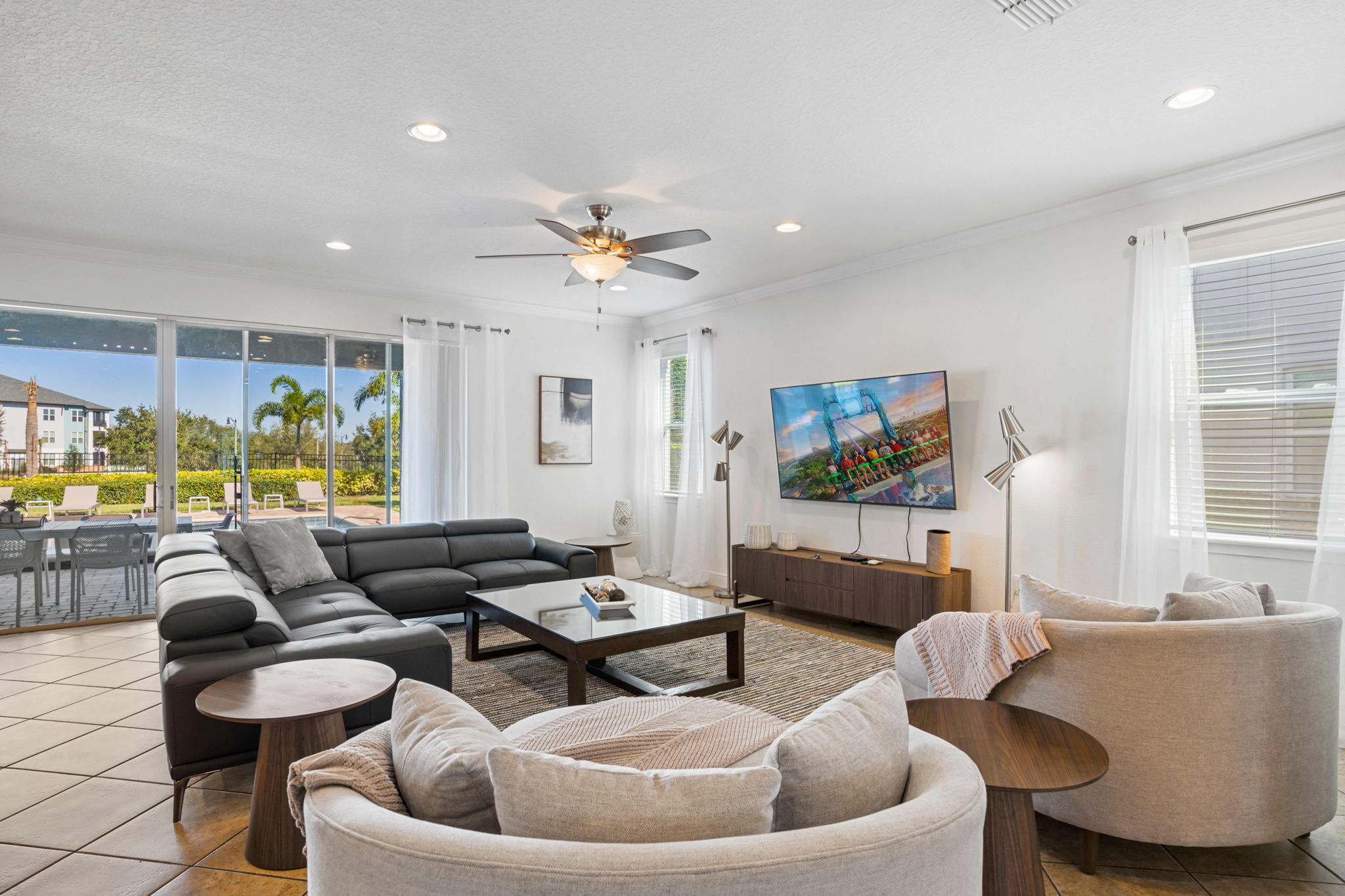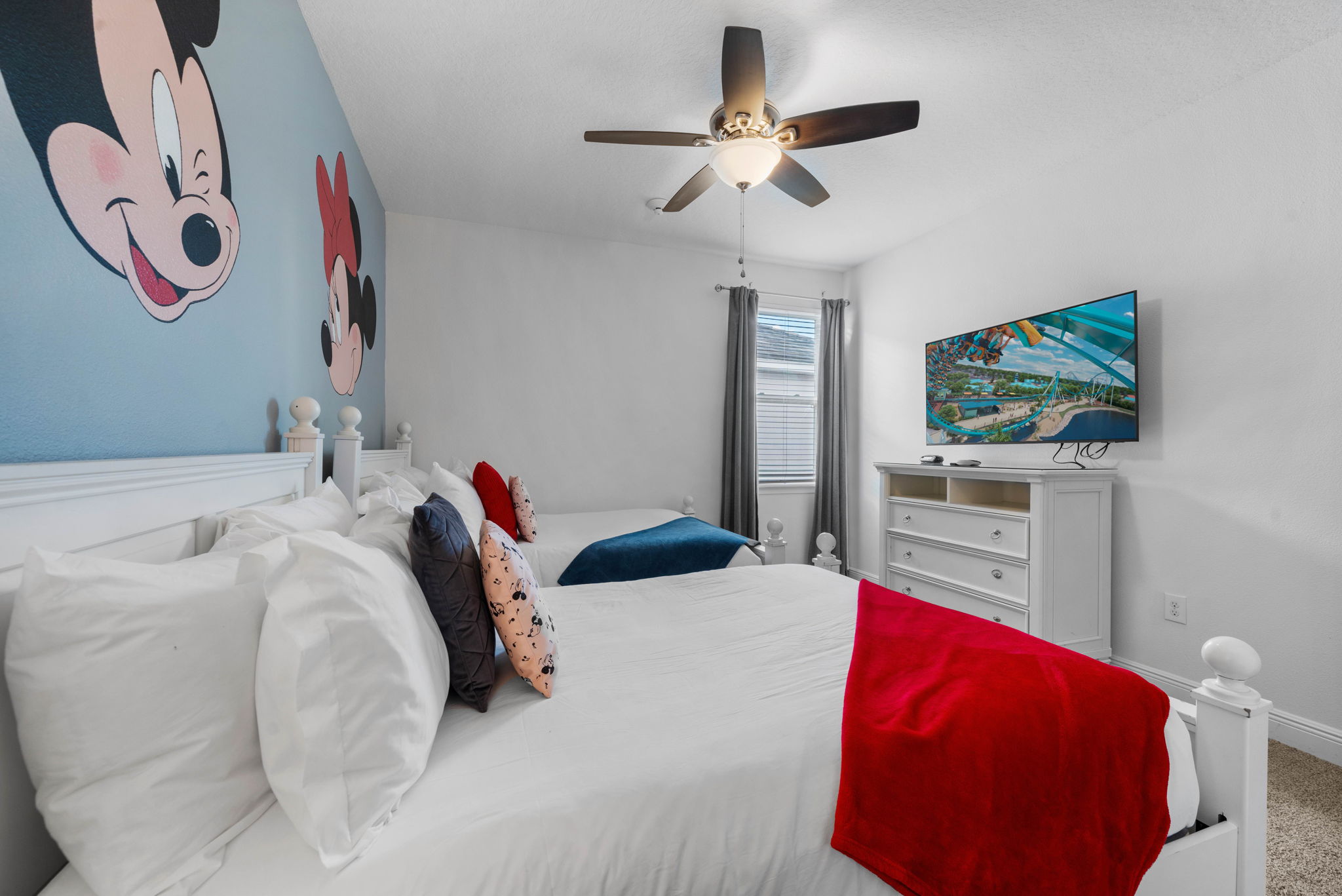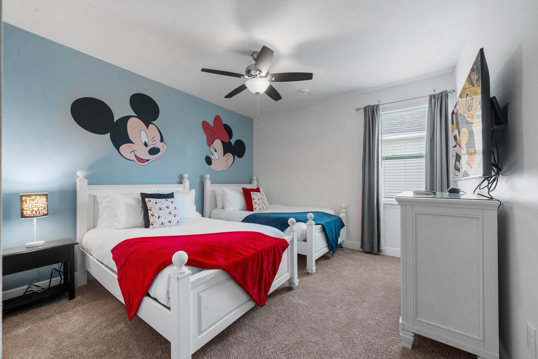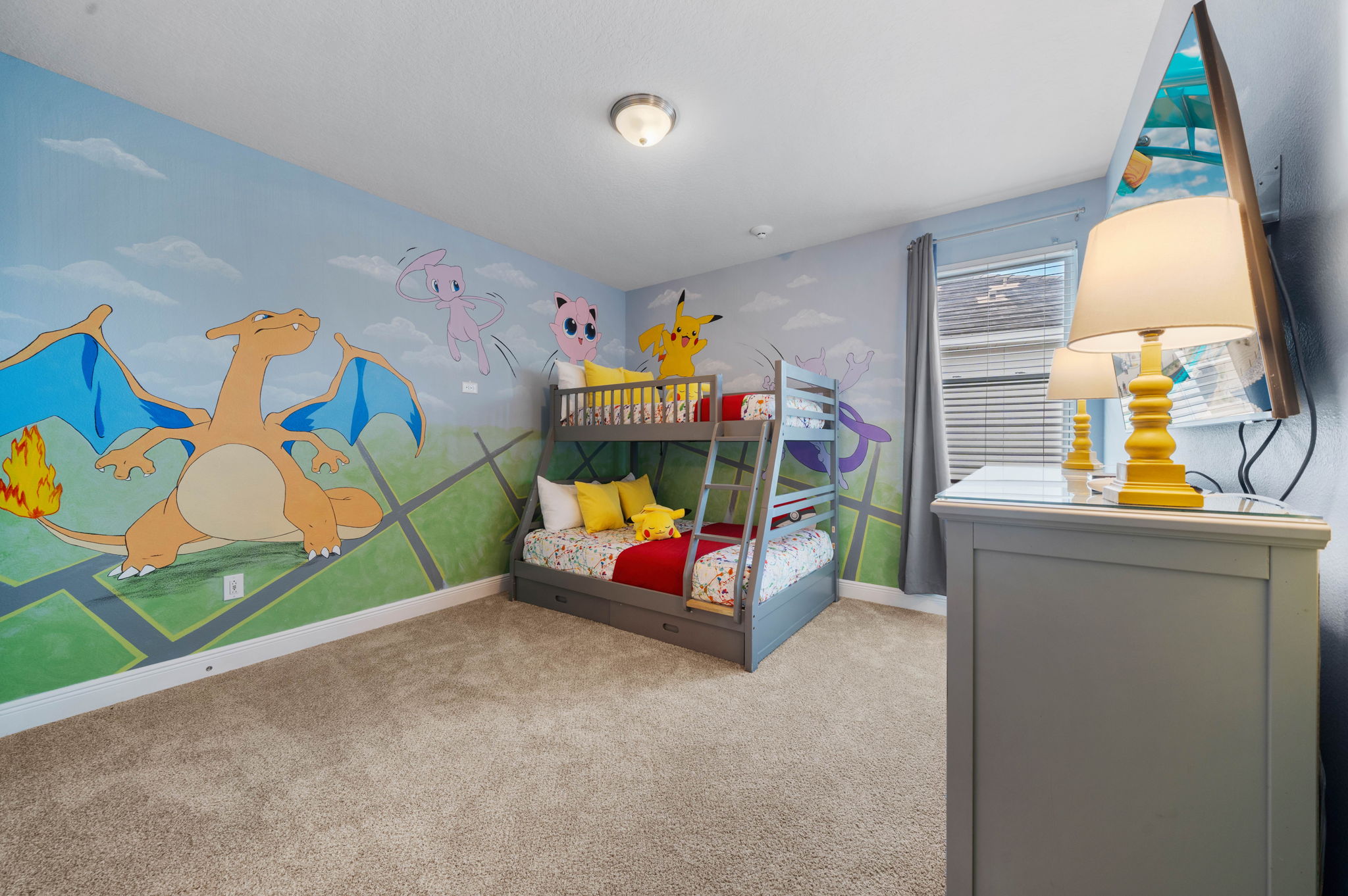 A fabulous, spacious 11 bedroom luxury villa that sleeps 22 people, perfectly suited for multiple families sharing or large family get togethers. Located in one of Orlando's premier resorts close to Disney, this beautiful home occupies a large lot providing privacy and space for outdoor games and relaxation. This substantial home enjoys open plan kitchen dining and seating area on the ground floor. The kitchen is fully equipped with everything you'd need, stainless steel appliances and marble counter tops. The dining table can accommodate up to 14 people, and a large L shaped sofa and armchairs with a wall mounted TV are next to large glass sliding doors that lead out to the pool deck. Upstairs, a large loft room with kitchenette, Pool table, bar area, drinks fridge and TV with X Box provide an alternative space for adults or children to hang out. There's also a separate cinema room has stepped seating and a large screen with projector for that movie night in. There is a games room in the converted garage which features a basketball game, foosball and a ping pong table. With four king sized ensuite bedrooms on the ground floor, and upstairs, two king ensuite bedrooms, a king bedroom, a queen bedroom, a twin and full ensuite bedroom, a twin full bed ensuite bedroom, and a twin bunk ensuite bedroom. Resort amenities, including water park access, are NOT available for stays at this house. However, you can still visit the clubhouse's restaurant, bar and gift shop.