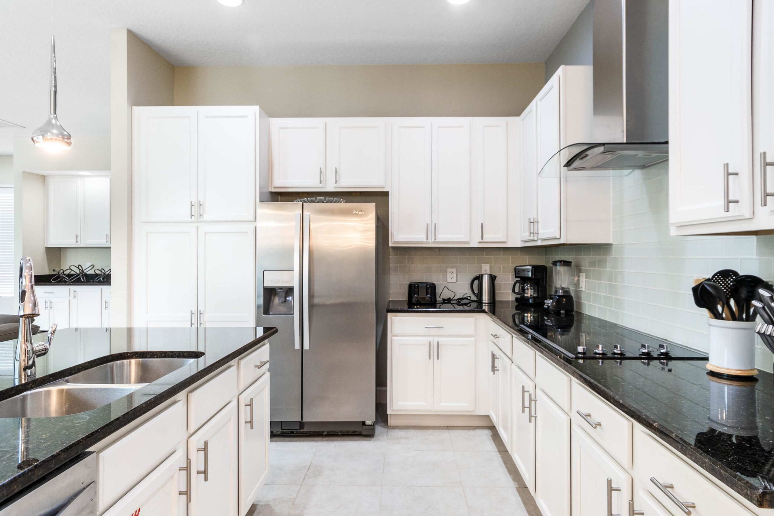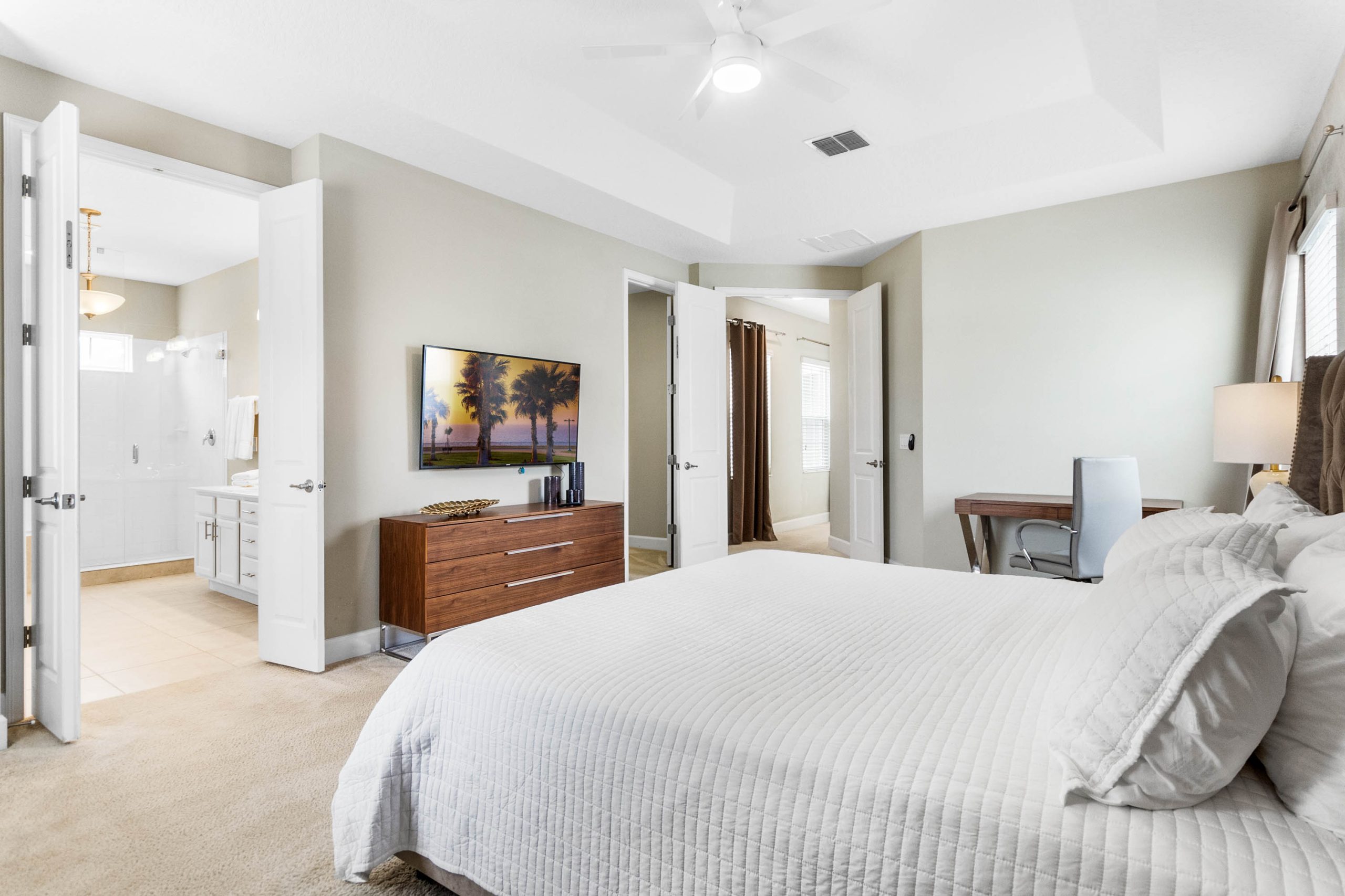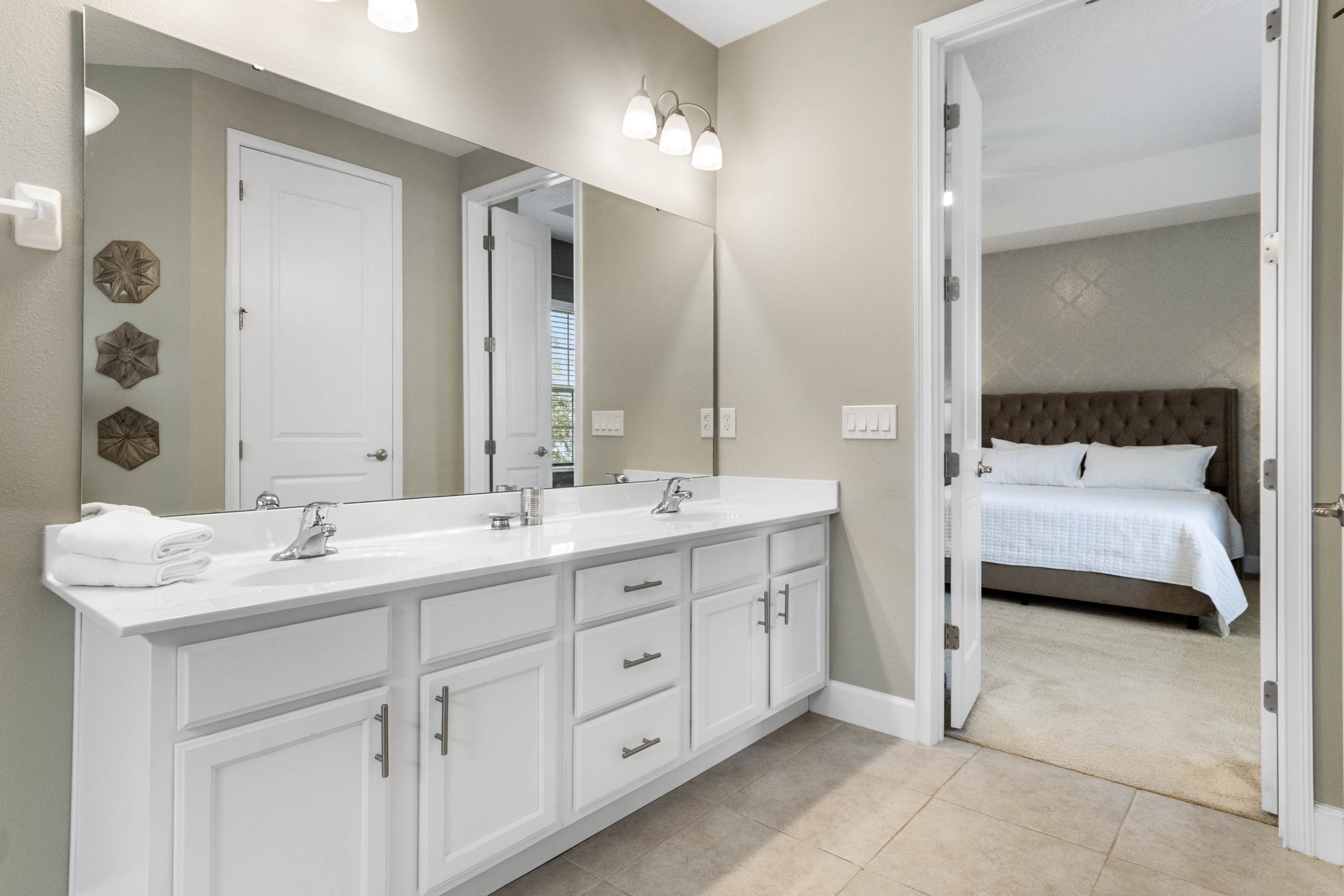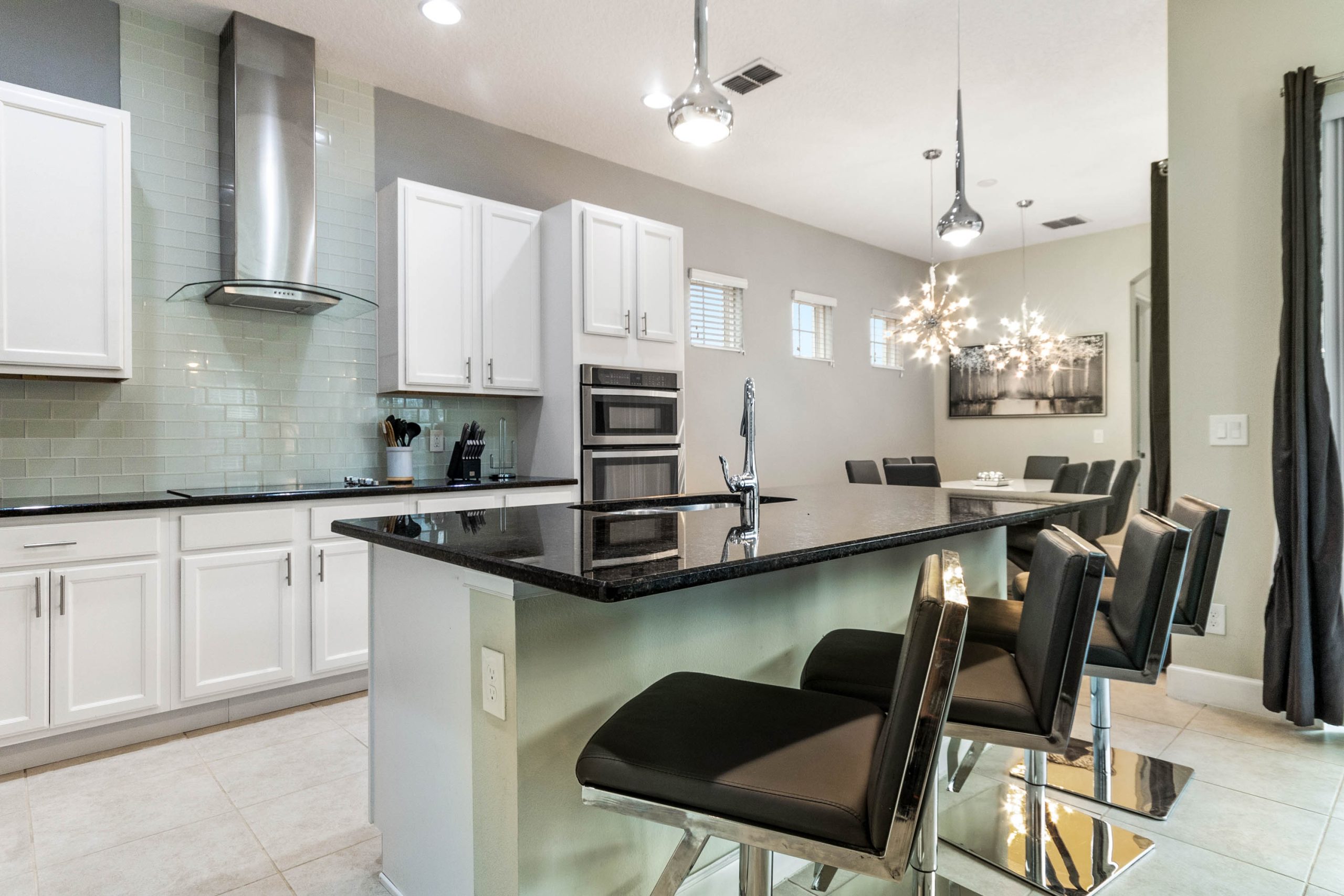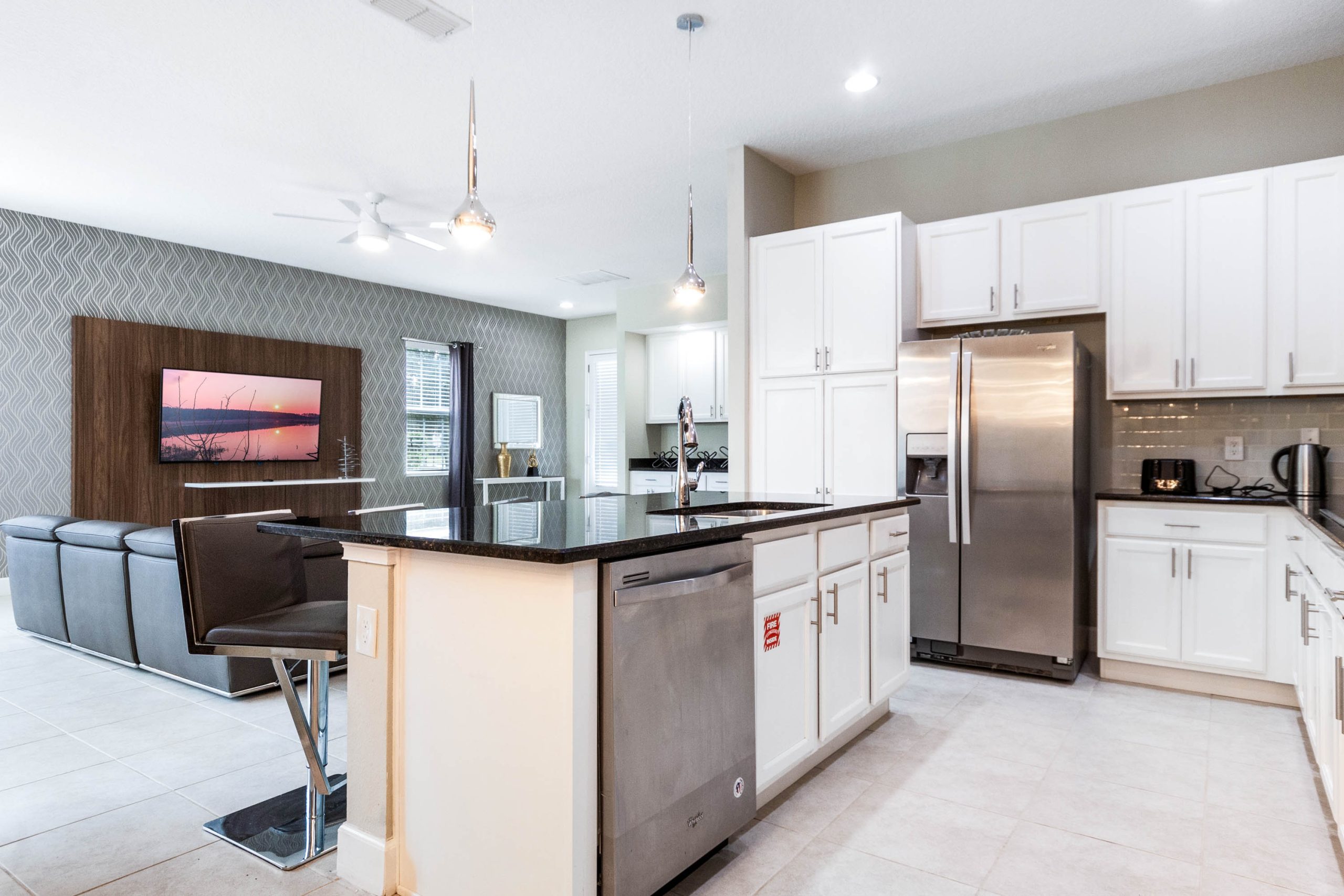 Stunning 3,045 sq. ft pool home located in the prestigious Patriots Landing neighborhood of Reunion Resort. This exclusive community offers Key West style villas with charming pastel colour schemes, surrounded on three sides by serene conservation areas and overlooking the Arnold Palmer Legacy Golf Course. This beautifully decorated and kitted out home has five bedrooms with a King ensuite, two Queen size bedrooms, a twin with two full sized beds, and a twin room. The open plan ground floor includes a large comfy seating area with a flat screen smart tv, the fully equipped kitchen, and a dining table with seating for eight, and two sets of sliding doors out on to the pool deck. There's also a large upstairs lounge room with an extra large tv and a mini bar.