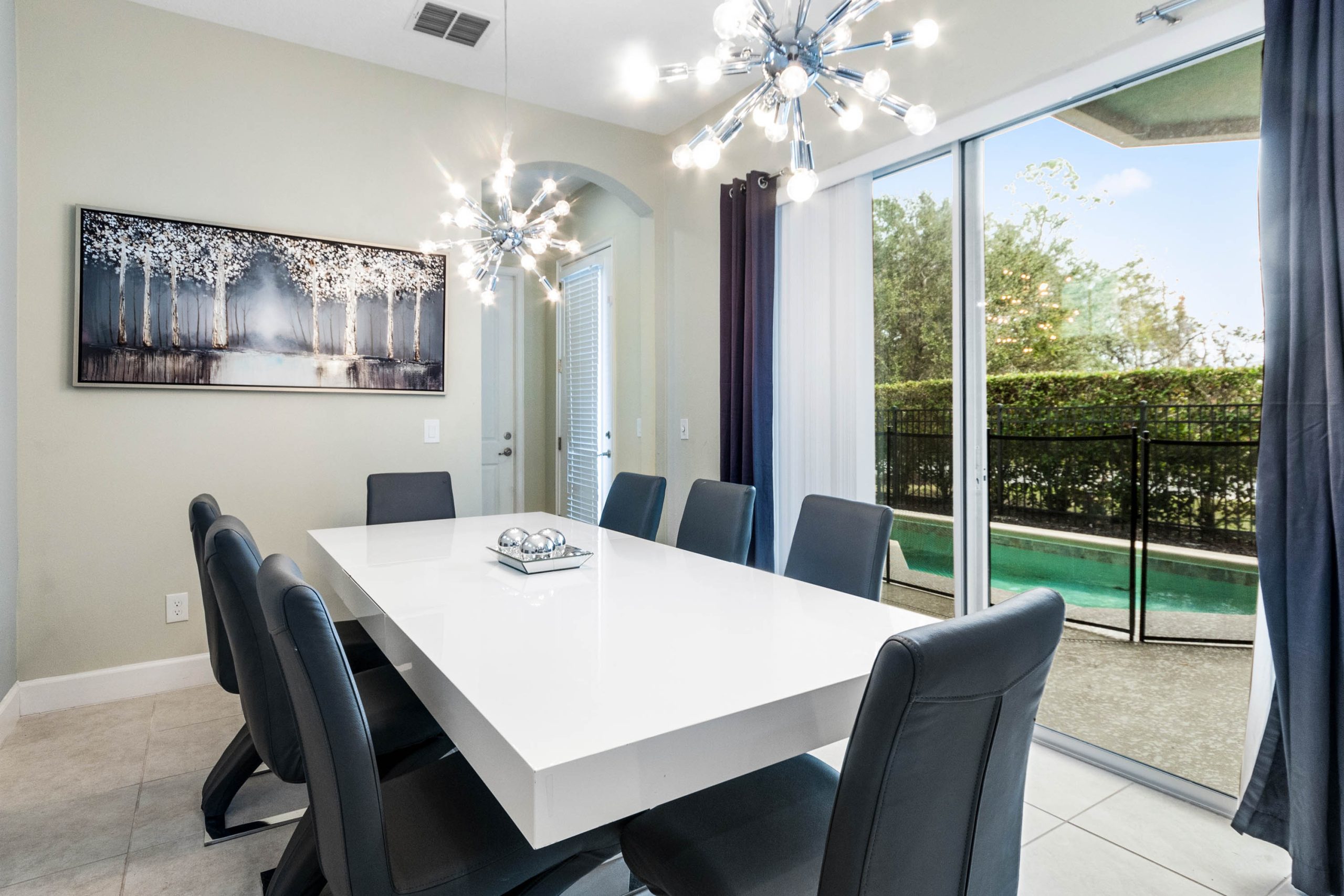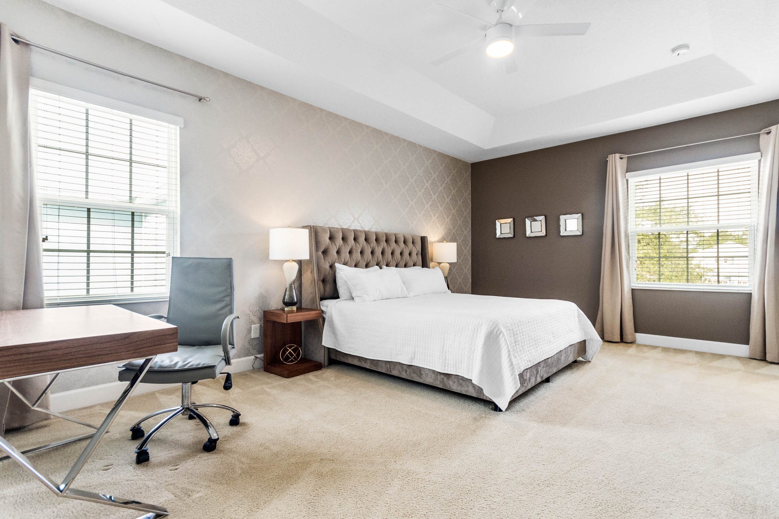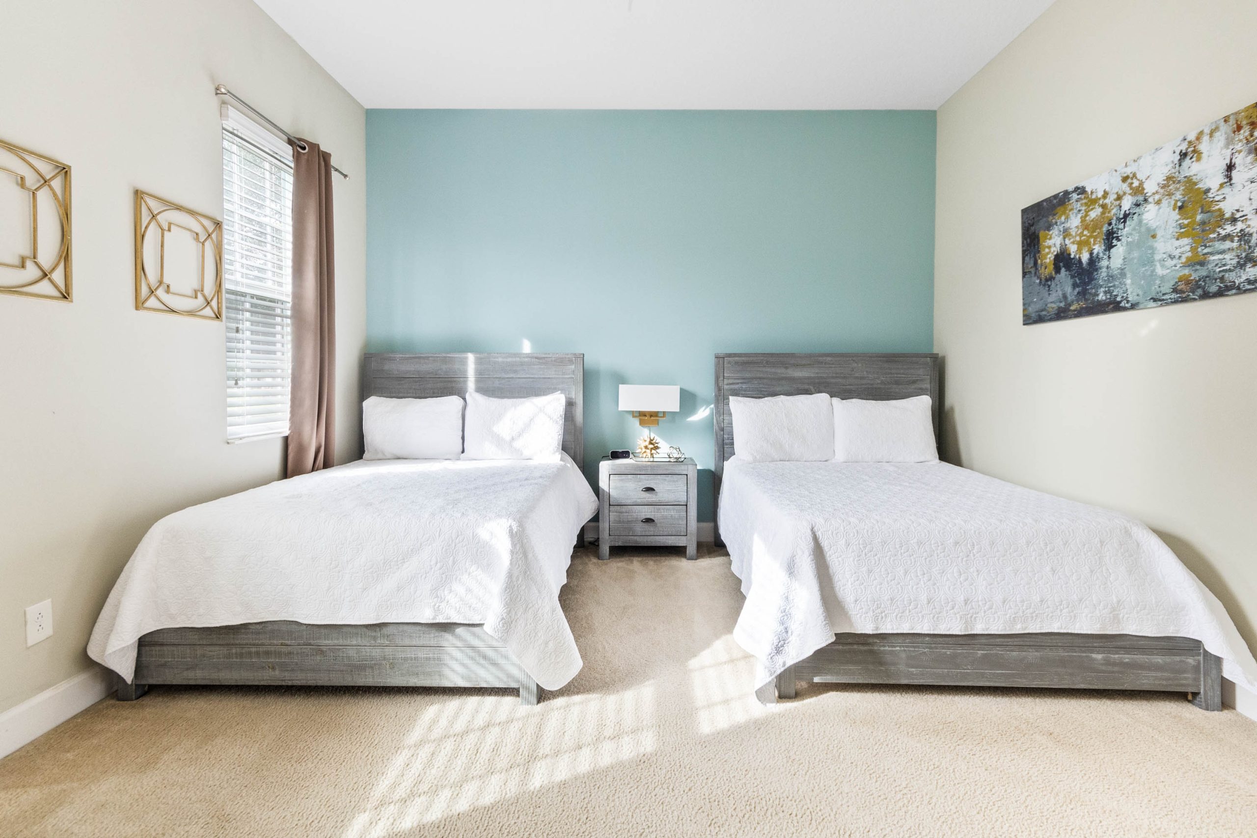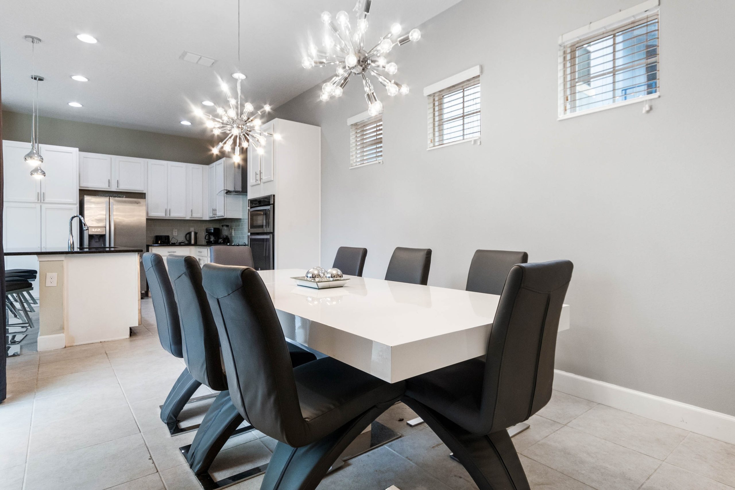 Stunning 3,045 sq. ft pool home located in the prestigious Patriots Landing neighborhood of Reunion Resort. This exclusive community offers Key West style villas with charming pastel colour schemes, surrounded on three sides by serene conservation areas and overlooking the Arnold Palmer Legacy Golf Course. This beautifully decorated and kitted out home has five bedrooms with a King ensuite, two Queen size bedrooms, a twin with two full sized beds, and a twin room. The open plan ground floor includes a large comfy seating area with a flat screen smart tv, the fully equipped kitchen, and a dining table with seating for eight, and two sets of sliding doors out on to the pool deck. There's also a large upstairs lounge room with an extra large tv and a mini bar.