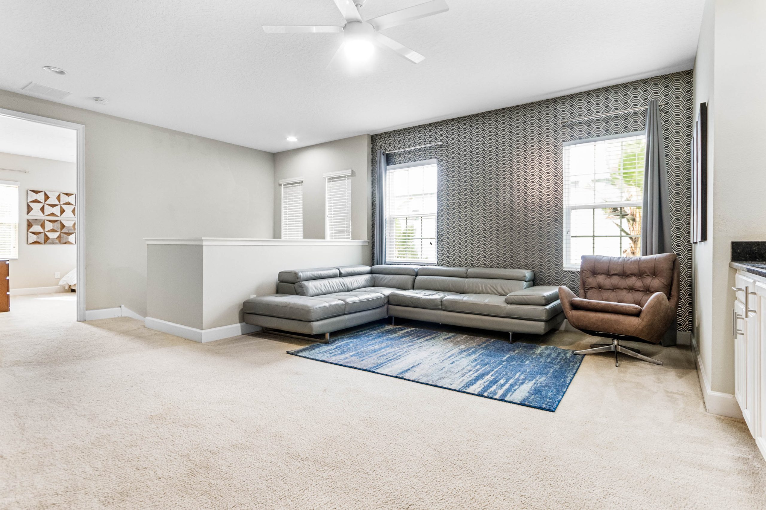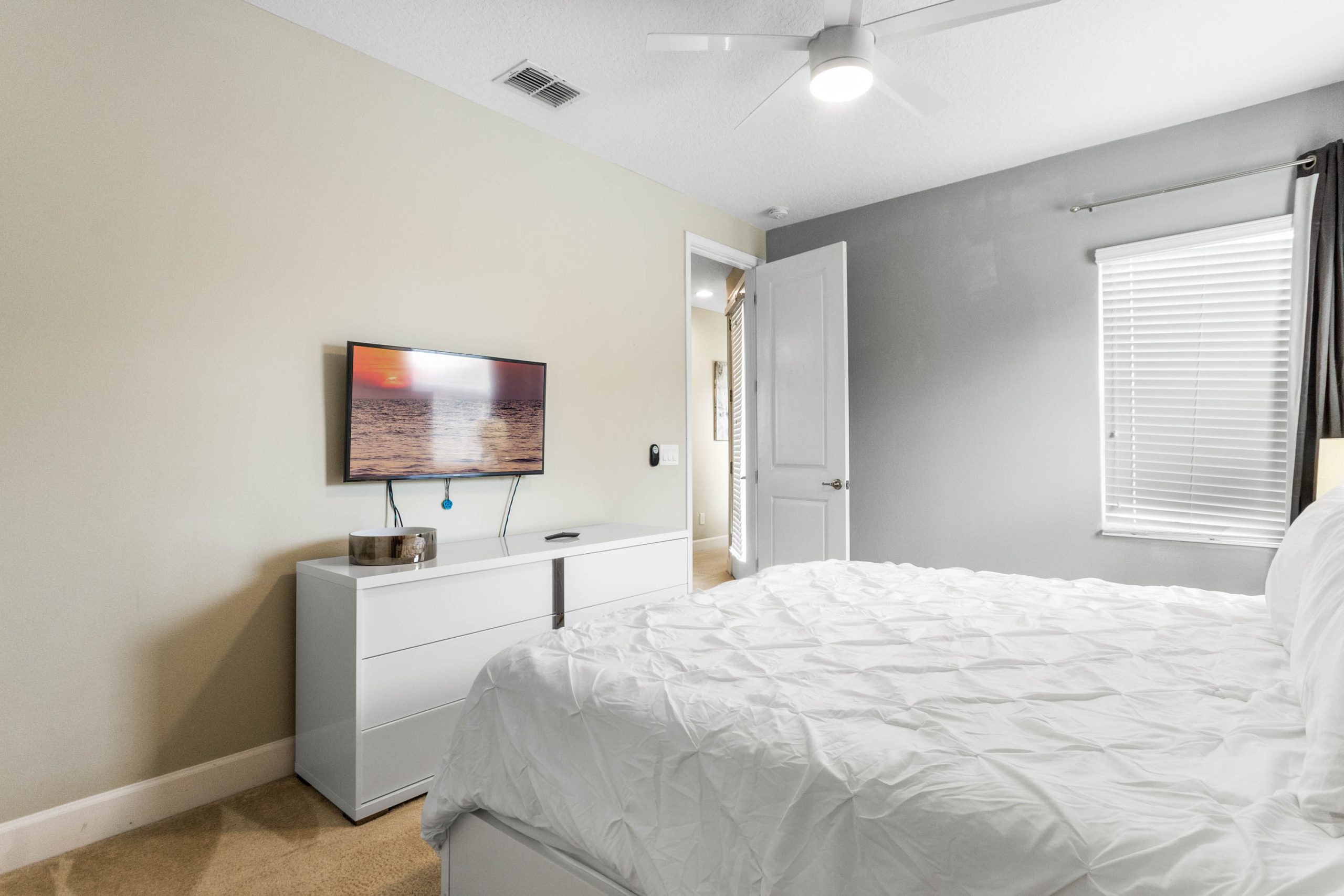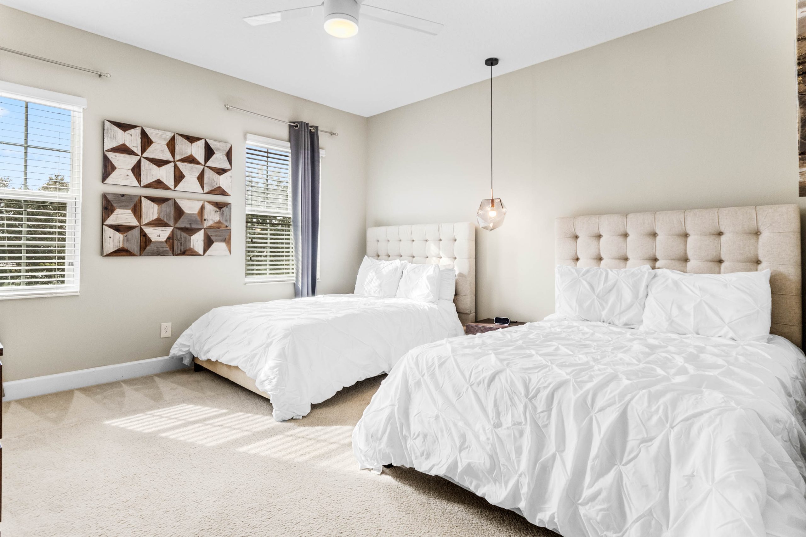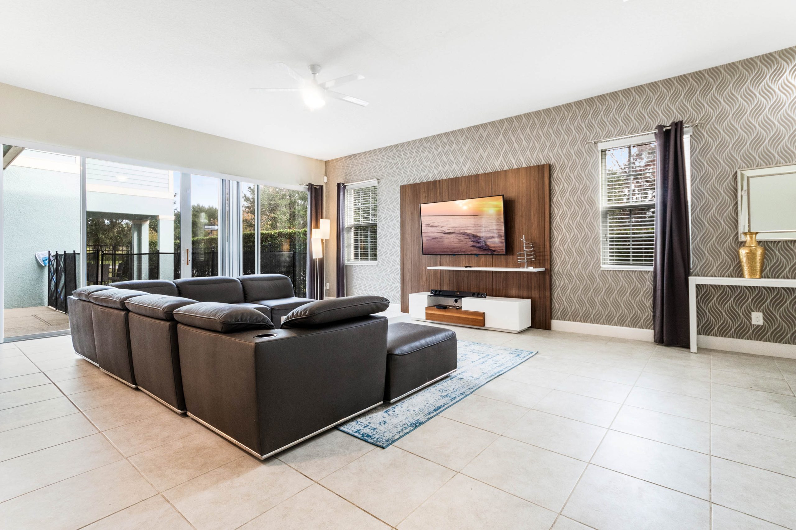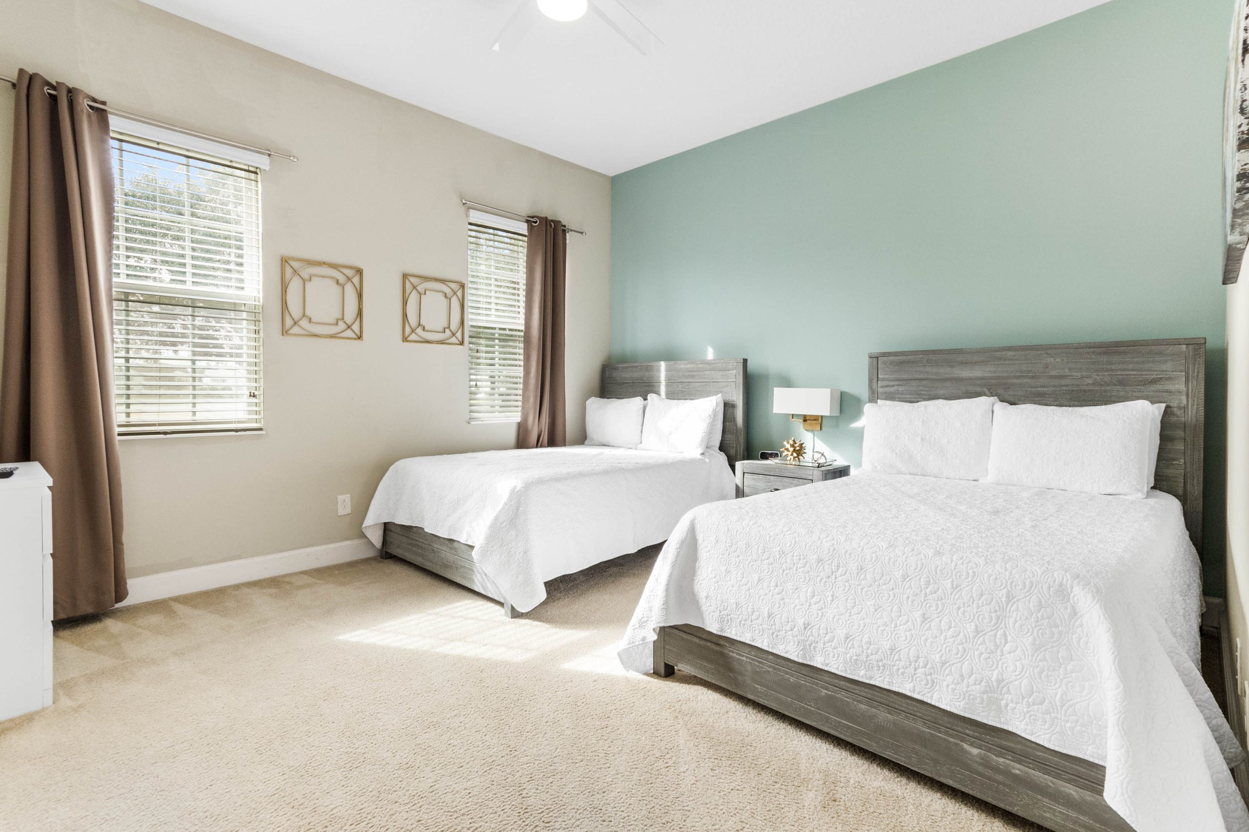 Stunning 3,045 sq. ft pool home located in the prestigious Patriots Landing neighborhood of Reunion Resort. This exclusive community offers Key West style villas with charming pastel colour schemes, surrounded on three sides by serene conservation areas and overlooking the Arnold Palmer Legacy Golf Course. This beautifully decorated and kitted out home has five bedrooms with a King ensuite, two Queen size bedrooms, a twin with two full sized beds, and a twin room. The open plan ground floor includes a large comfy seating area with a flat screen smart tv, the fully equipped kitchen, and a dining table with seating for eight, and two sets of sliding doors out on to the pool deck. There's also a large upstairs lounge room with an extra large tv and a mini bar.