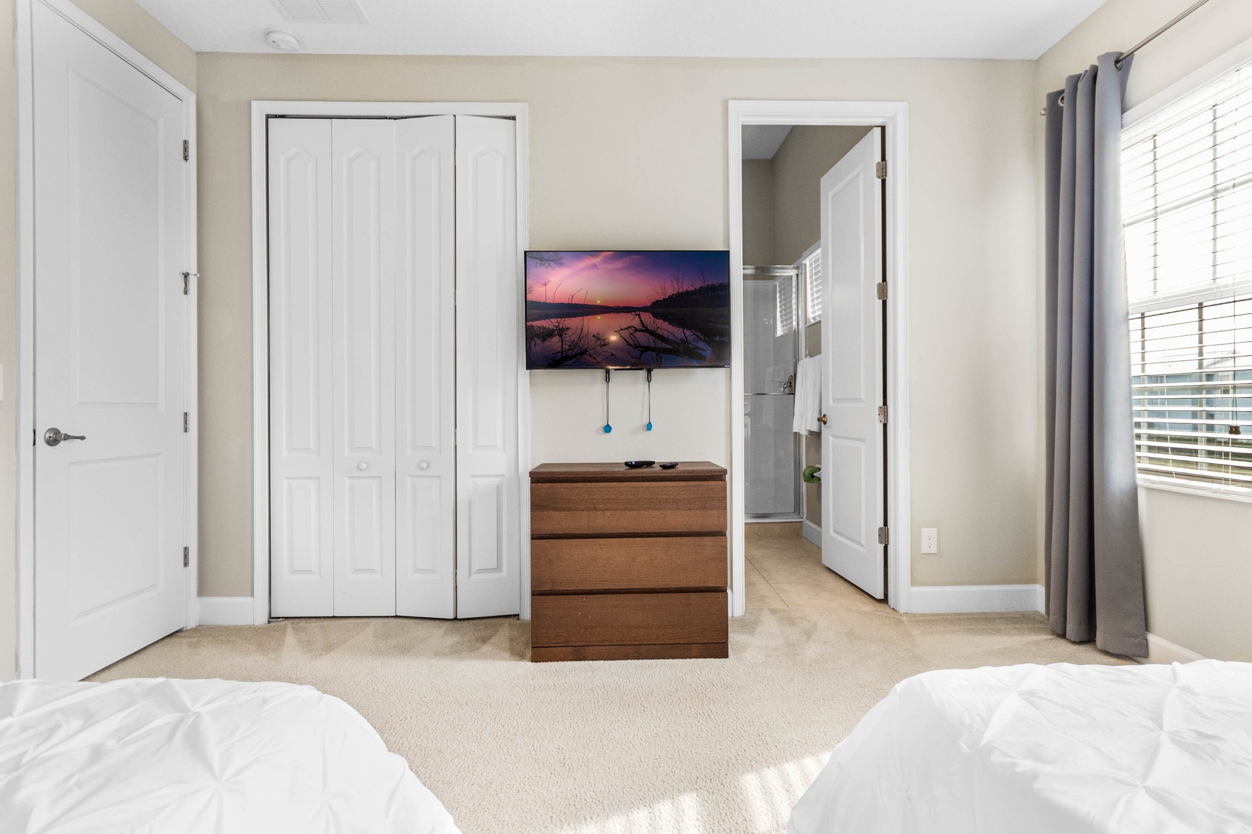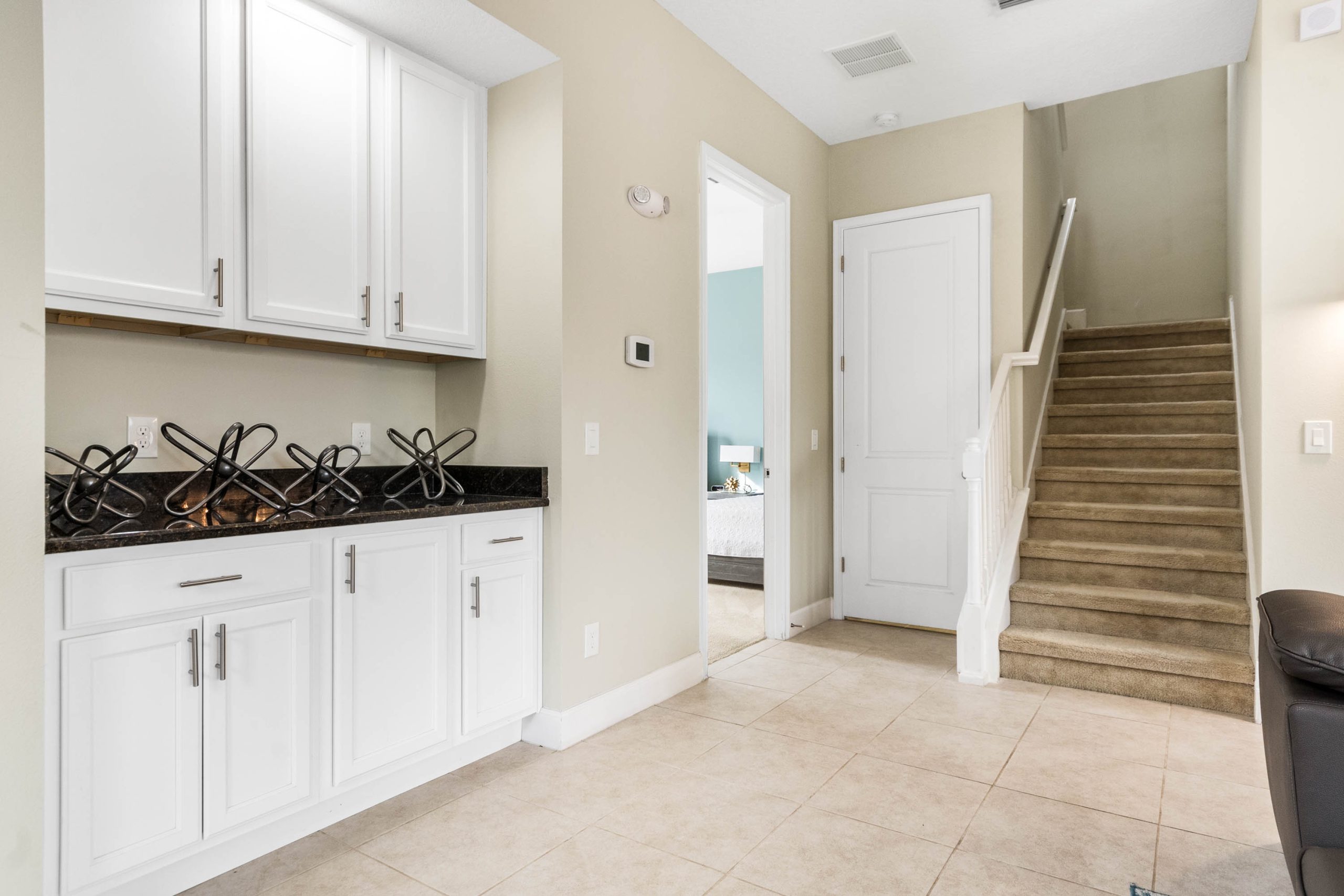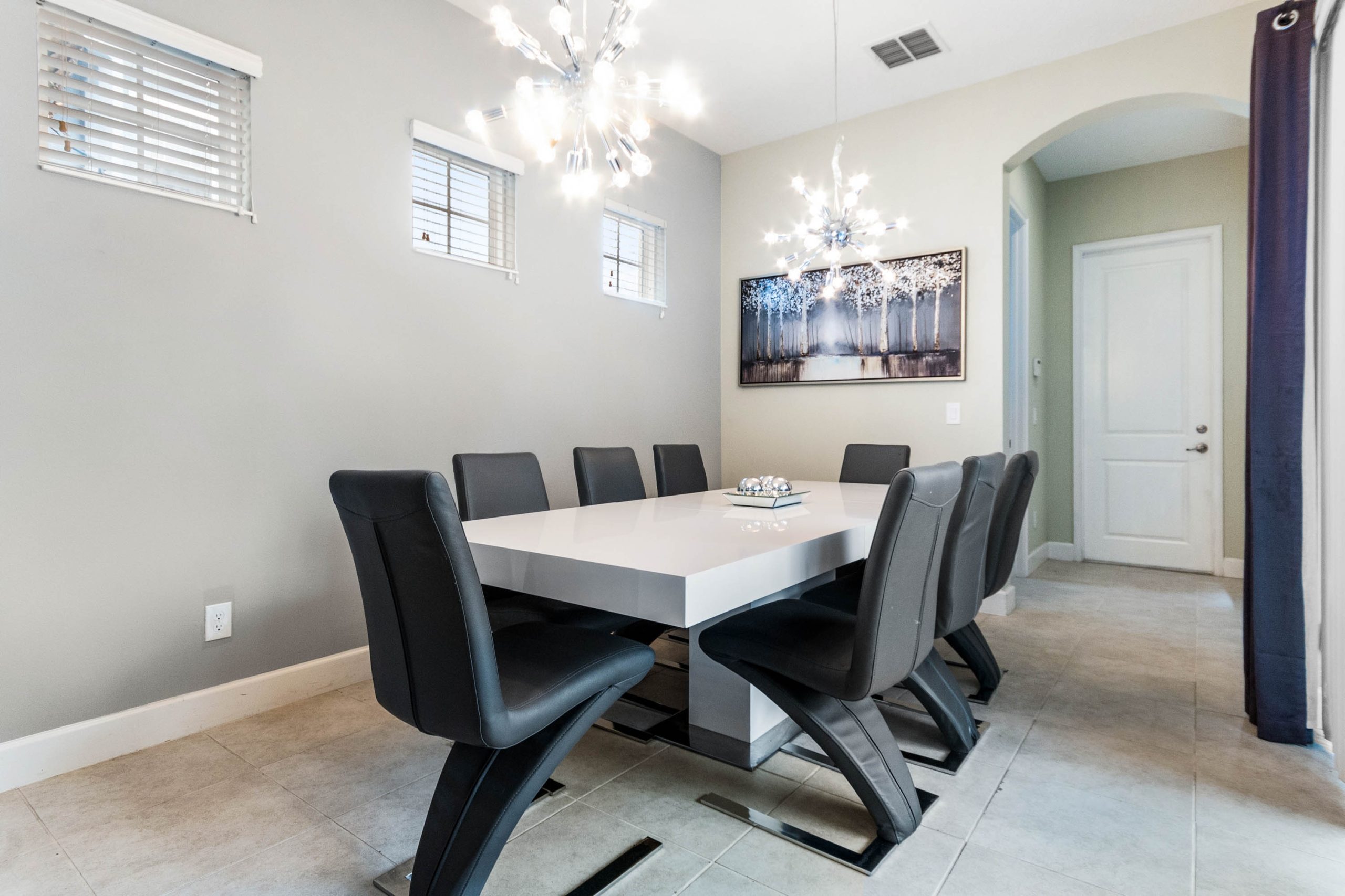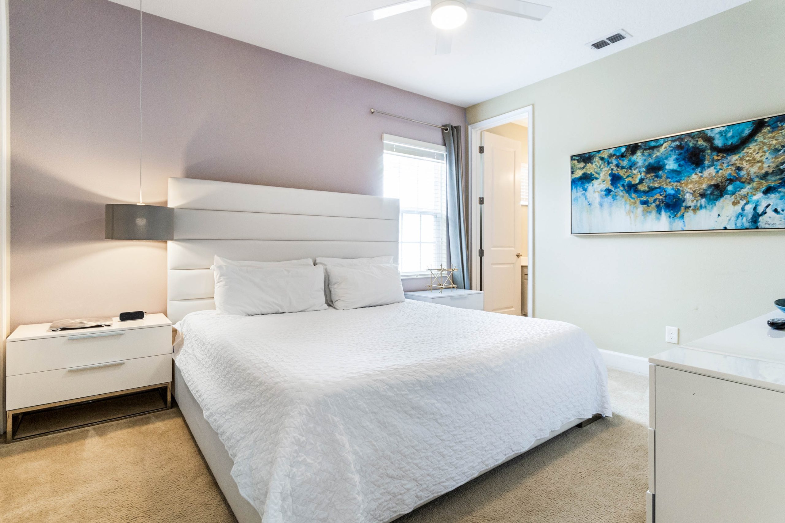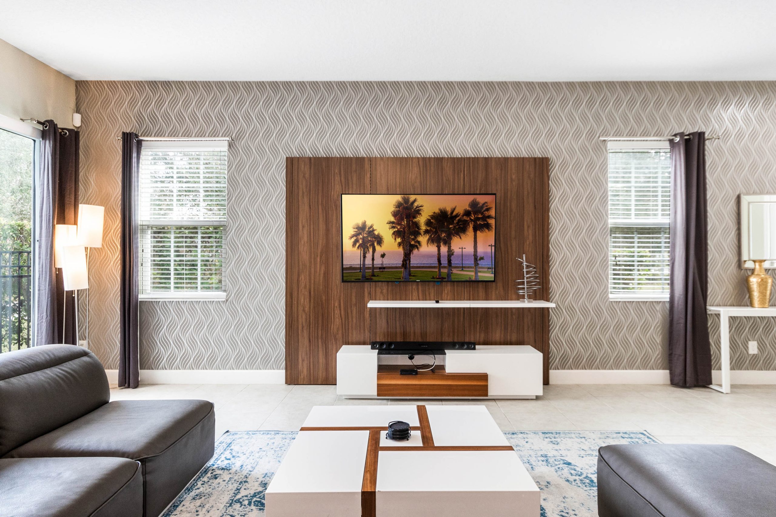 Stunning 3,045 sq. ft pool home located in the prestigious Patriots Landing neighborhood of Reunion Resort. This exclusive community offers Key West style villas with charming pastel colour schemes, surrounded on three sides by serene conservation areas and overlooking the Arnold Palmer Legacy Golf Course. This beautifully decorated and kitted out home has five bedrooms with a King ensuite, two Queen size bedrooms, a twin with two full sized beds, and a twin room. The open plan ground floor includes a large comfy seating area with a flat screen smart tv, the fully equipped kitchen, and a dining table with seating for eight, and two sets of sliding doors out on to the pool deck. There's also a large upstairs lounge room with an extra large tv and a mini bar.