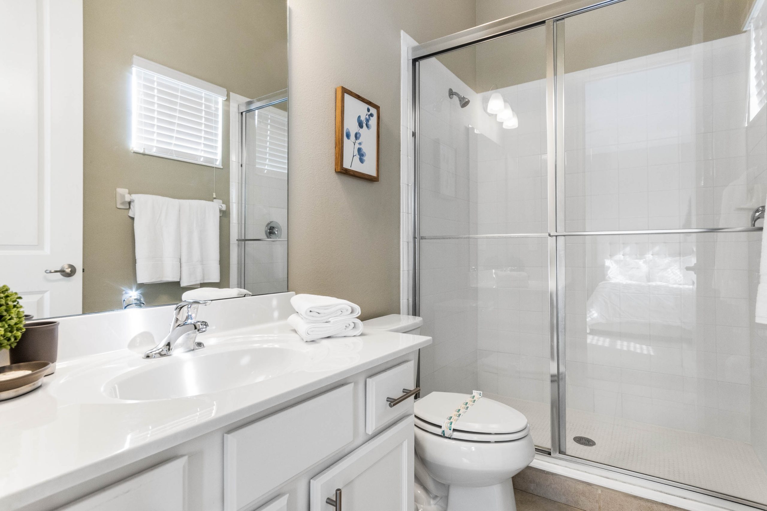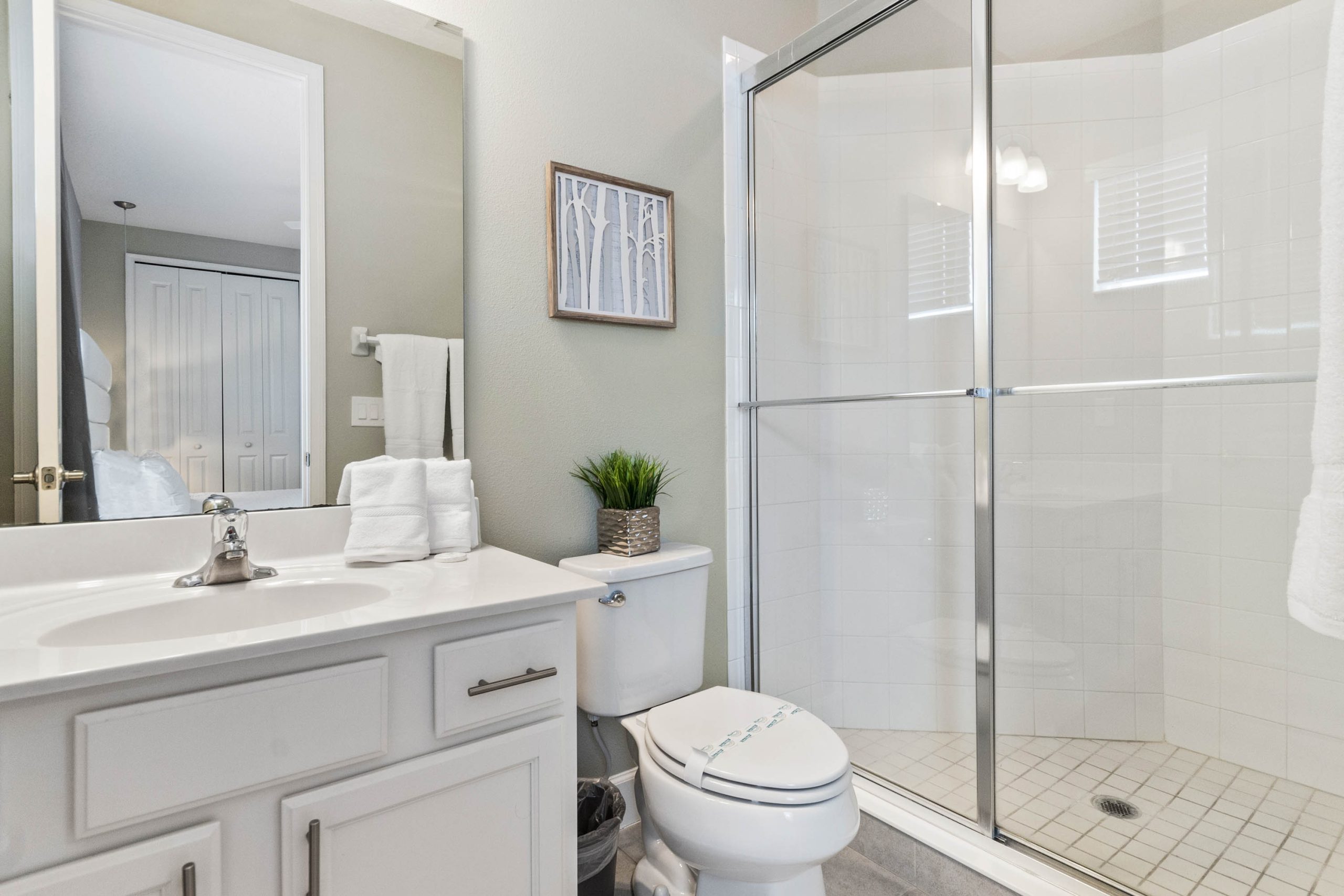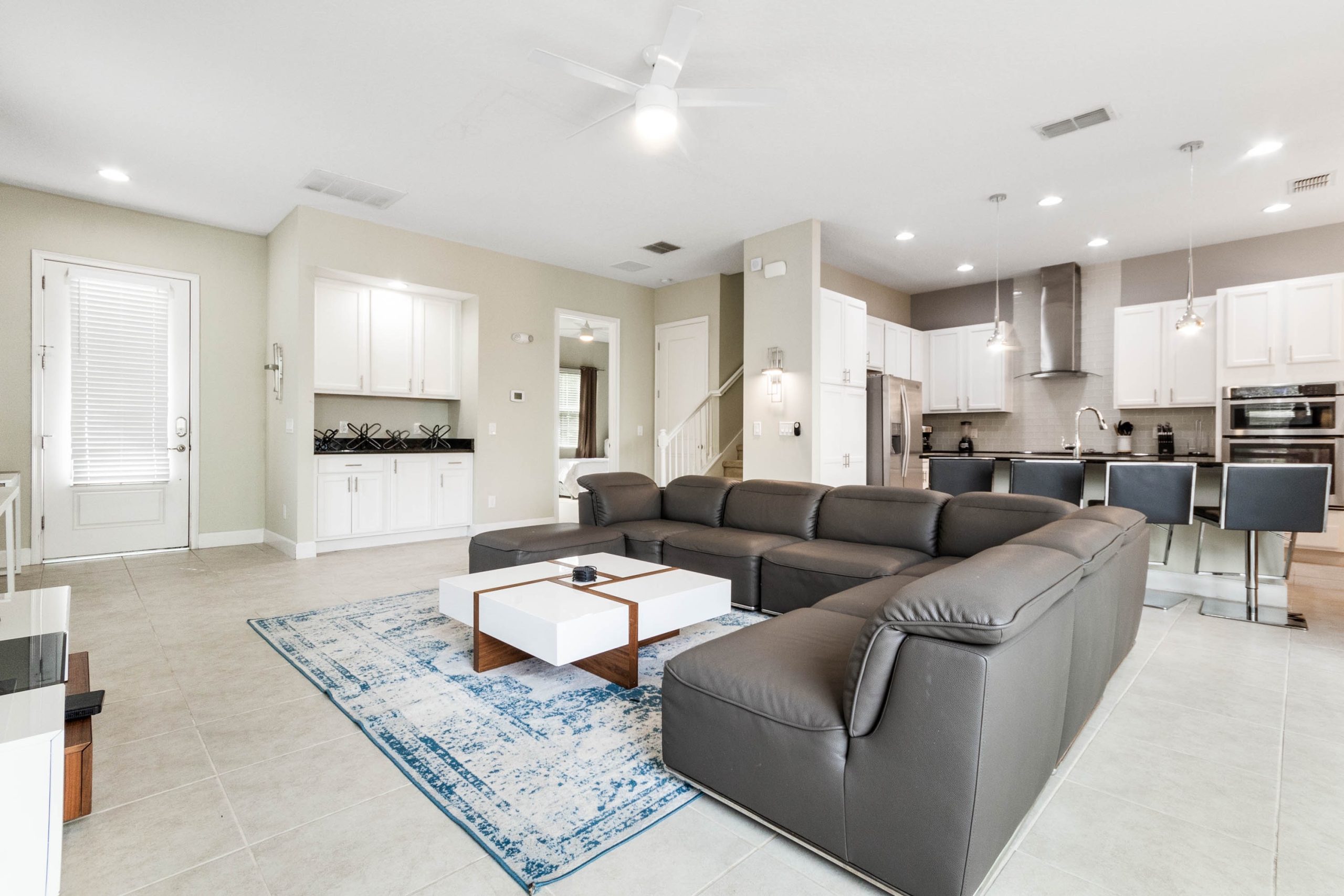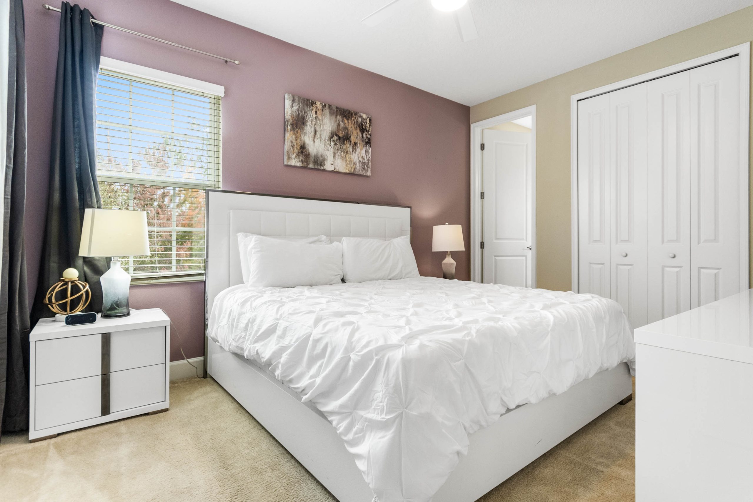 Stunning 3,045 sq. ft pool home located in the prestigious Patriots Landing neighborhood of Reunion Resort. This exclusive community offers Key West style villas with charming pastel colour schemes, surrounded on three sides by serene conservation areas and overlooking the Arnold Palmer Legacy Golf Course. This beautifully decorated and kitted out home has five bedrooms with a King ensuite, two Queen size bedrooms, a twin with two full sized beds, and a twin room. The open plan ground floor includes a large comfy seating area with a flat screen smart tv, the fully equipped kitchen, and a dining table with seating for eight, and two sets of sliding doors out on to the pool deck. There's also a large upstairs lounge room with an extra large tv and a mini bar.