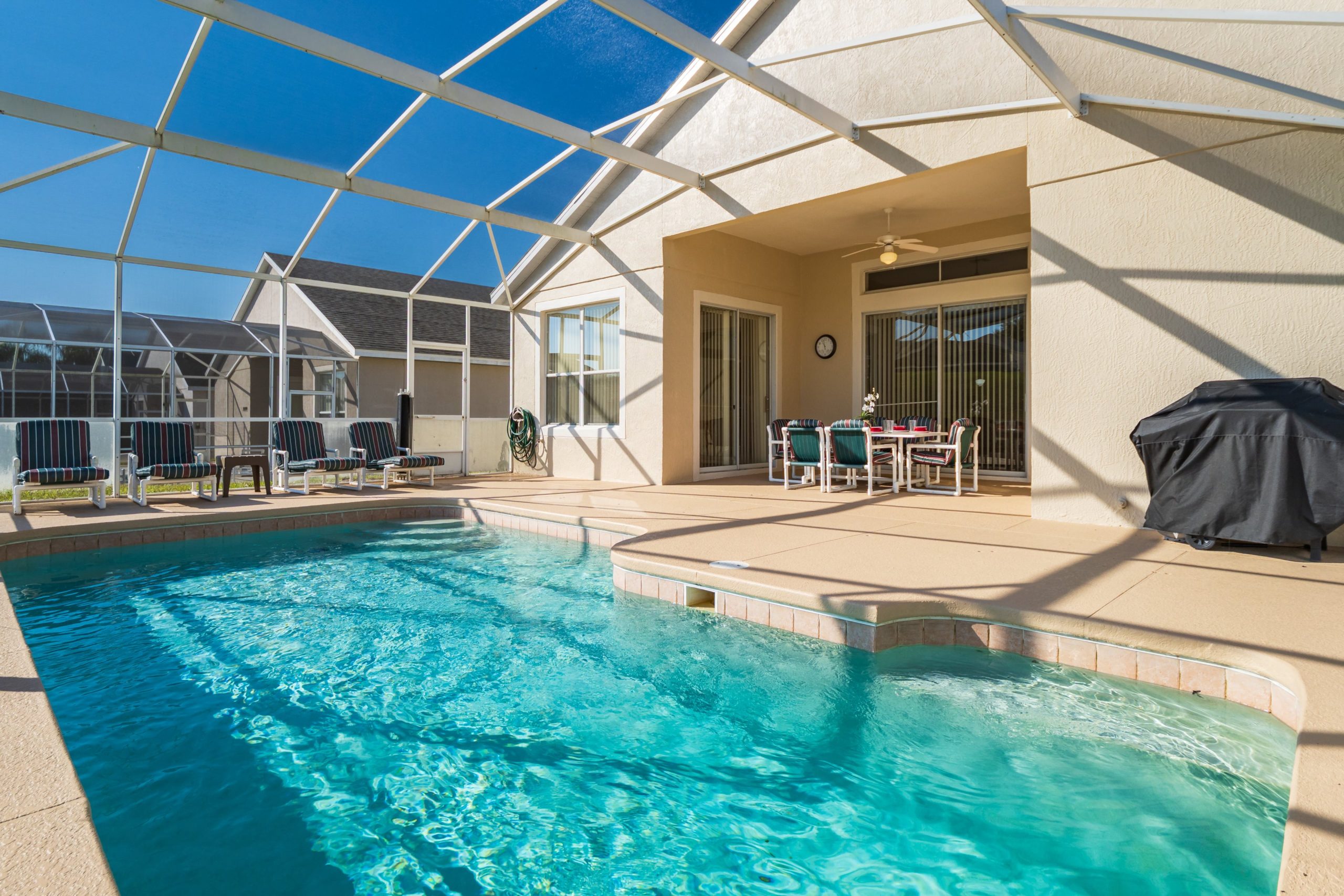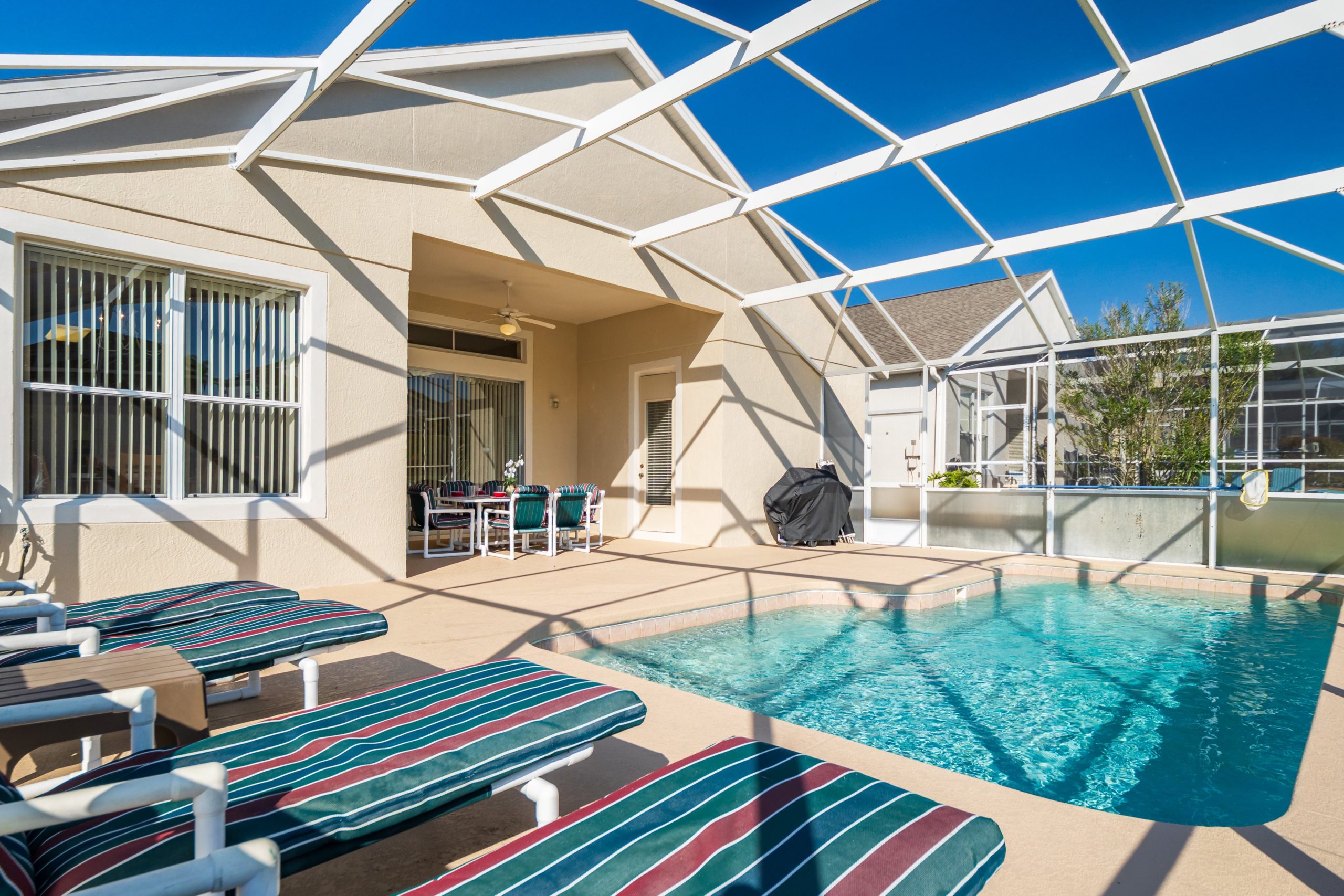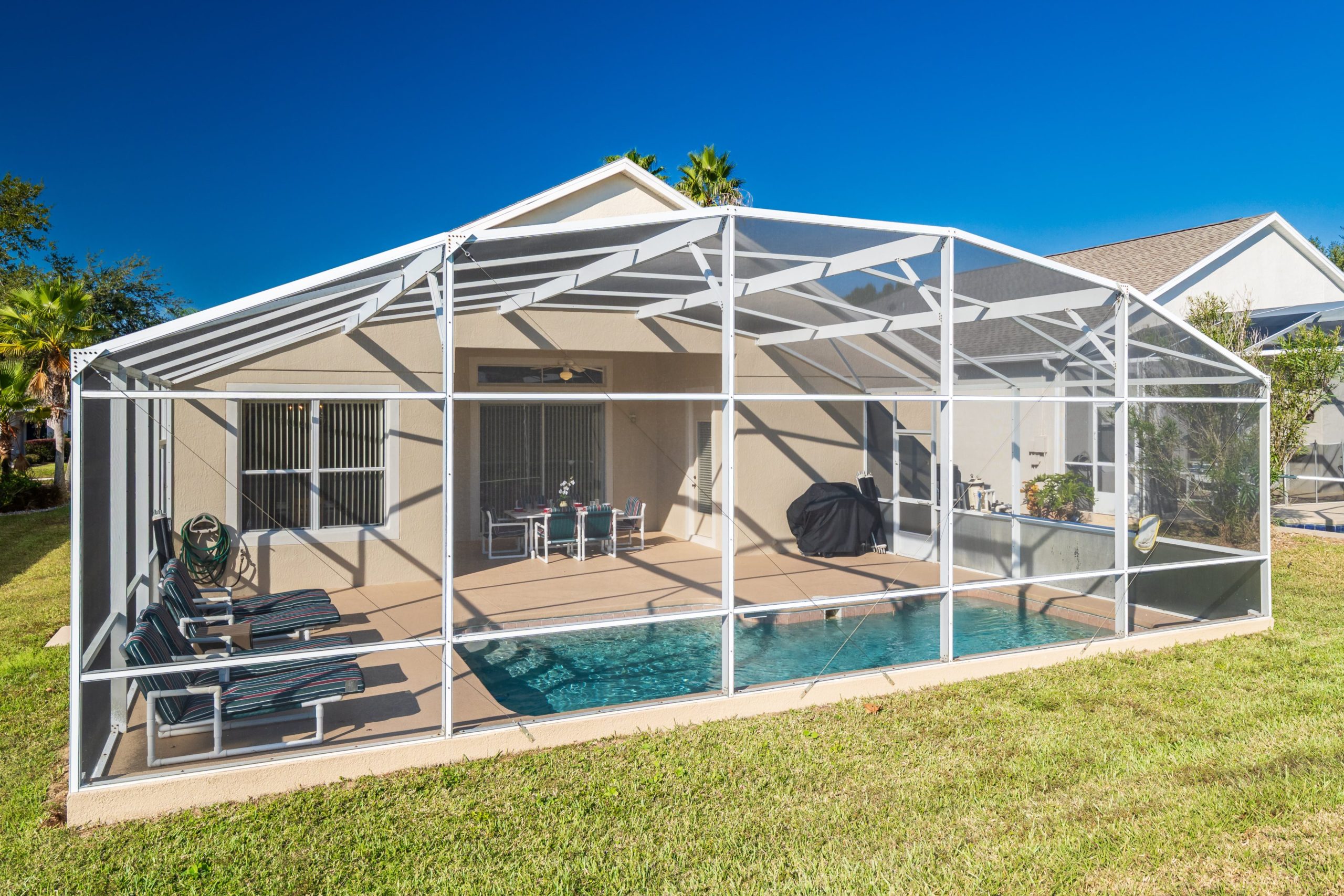 Screened lanai with table with 6 chairs. A gas BBQ is available for the use of guests.