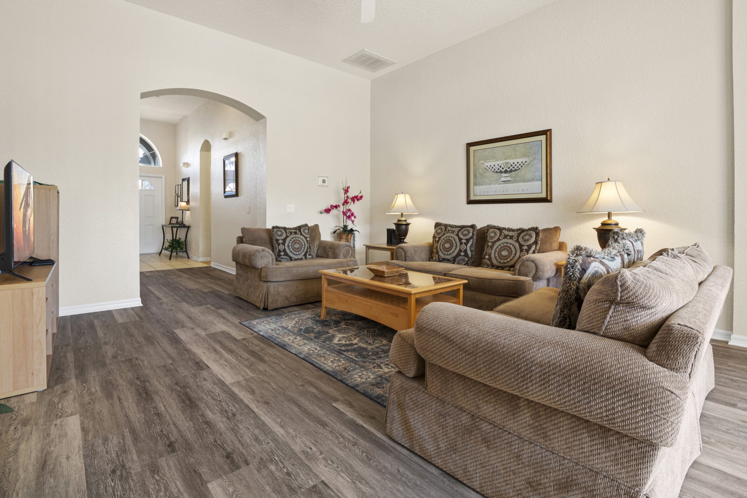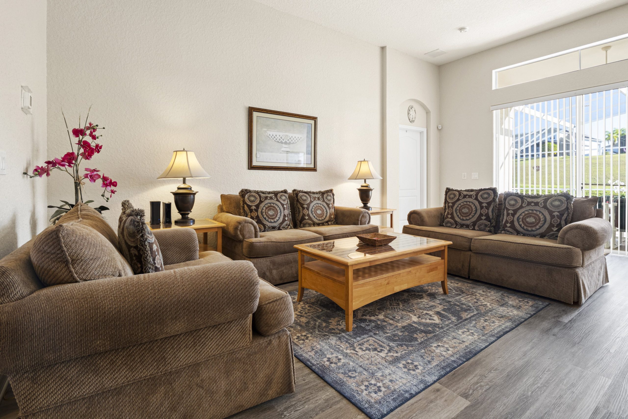 Two large sofas and armchair with large flat scree TV next to sliding doors out on to pool deck