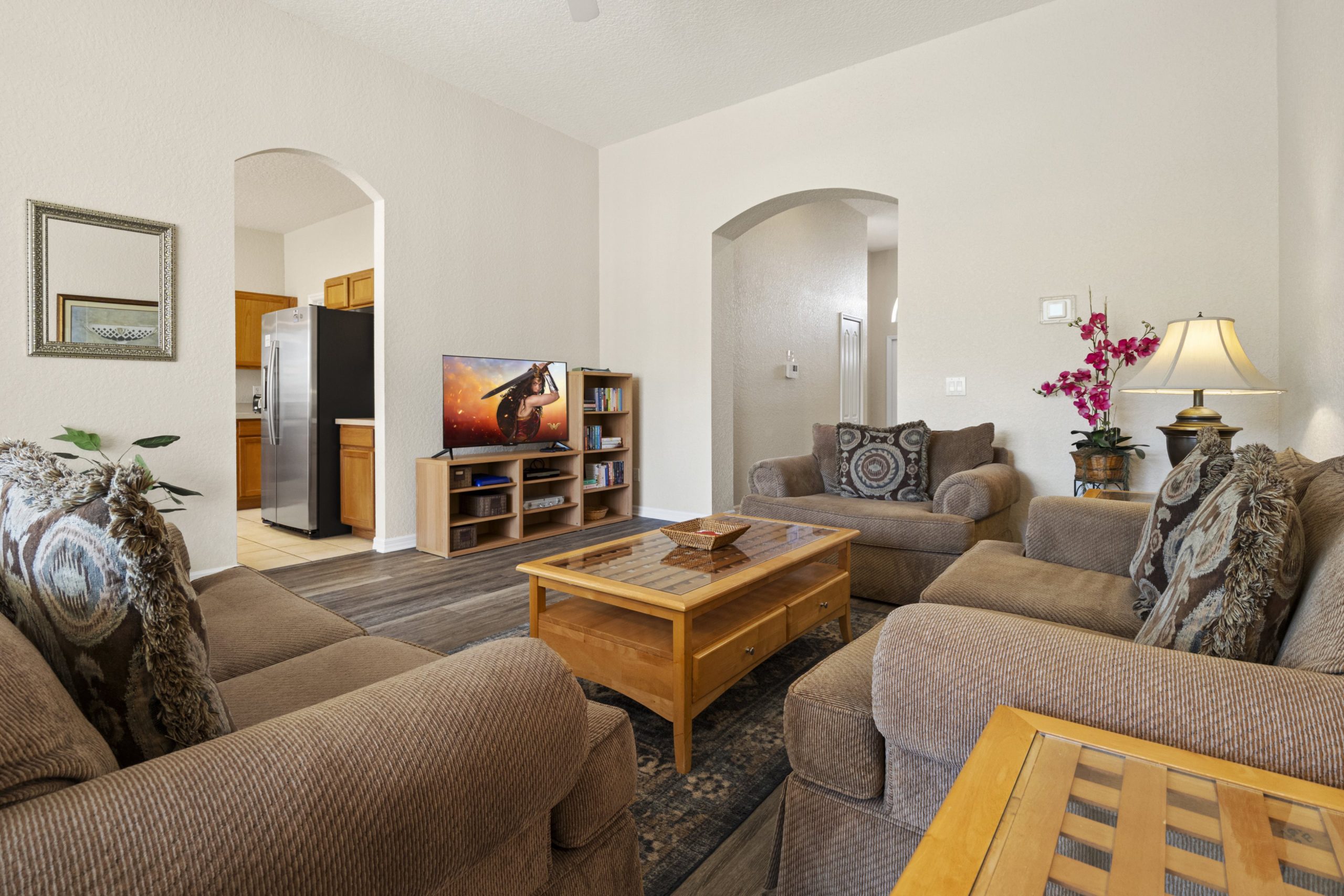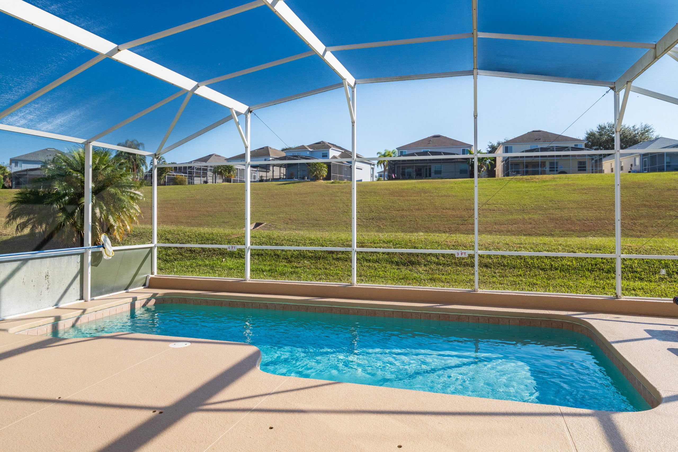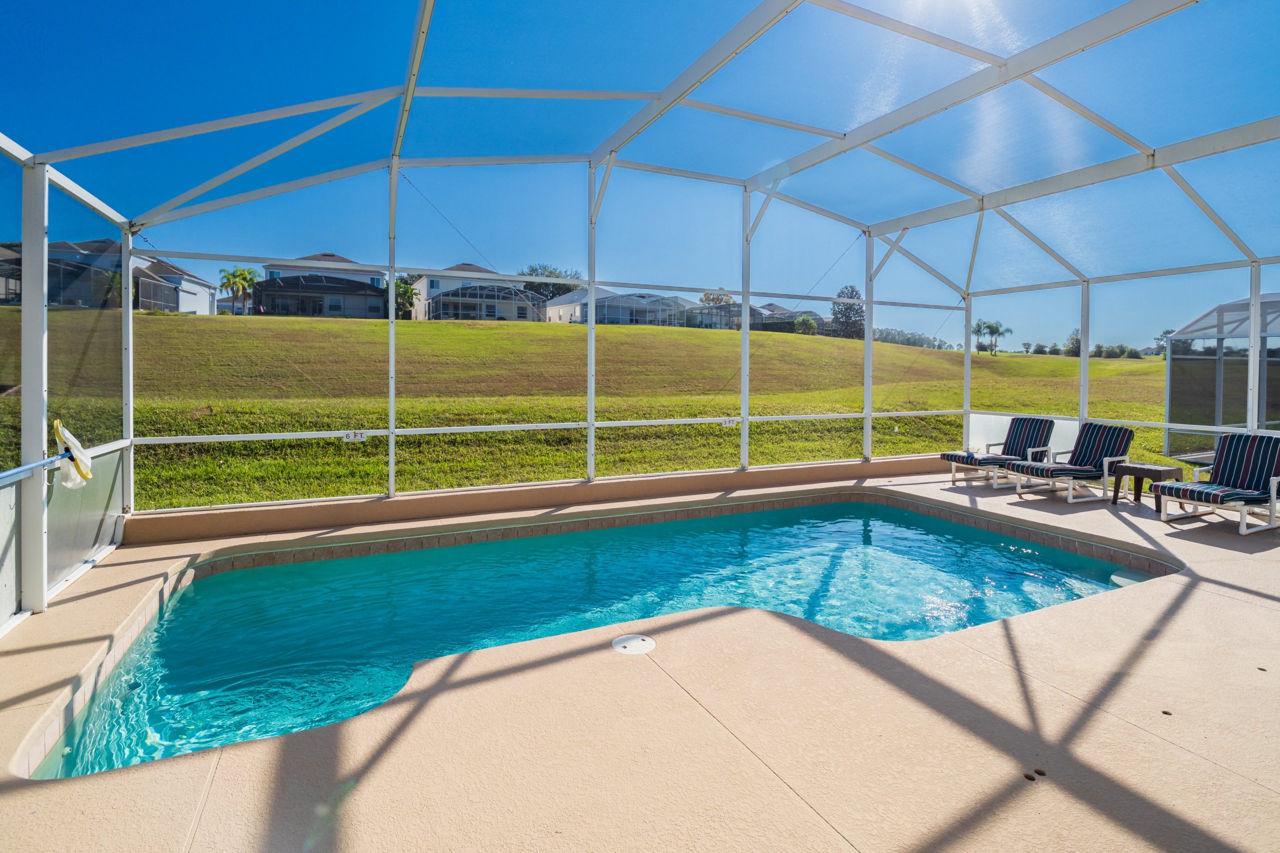 This spacious 4 bedroom 3 bathroom home has a lovely view across the golf course. To the front of the house are three of the bedrooms. From the hallway you walk through to the main large living room with patio doors to the pool. Alongside it is the kitchen and dining area. The master king size bedroom has an en-suite bathroom which leads directly out to the large pool deck where you can relax on the many sun loungers or enjoy an alfresco meal. For entertainment there's a games room in the garage. A wonderful setting for a fun family vacation.