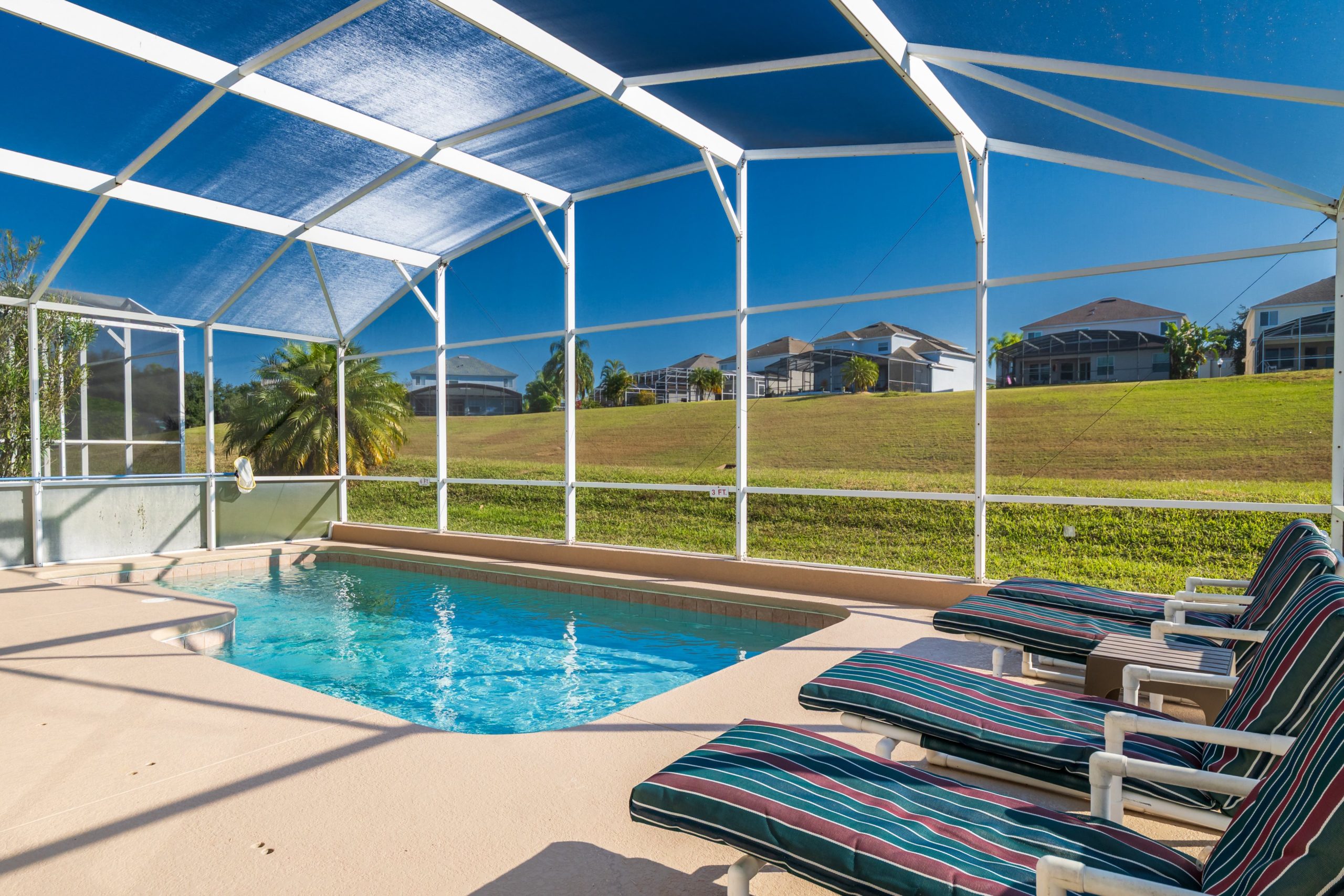 Pool & deck area with sun loungers.