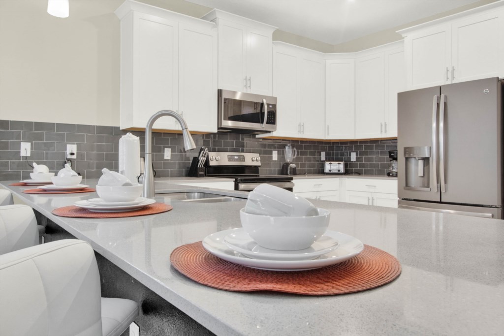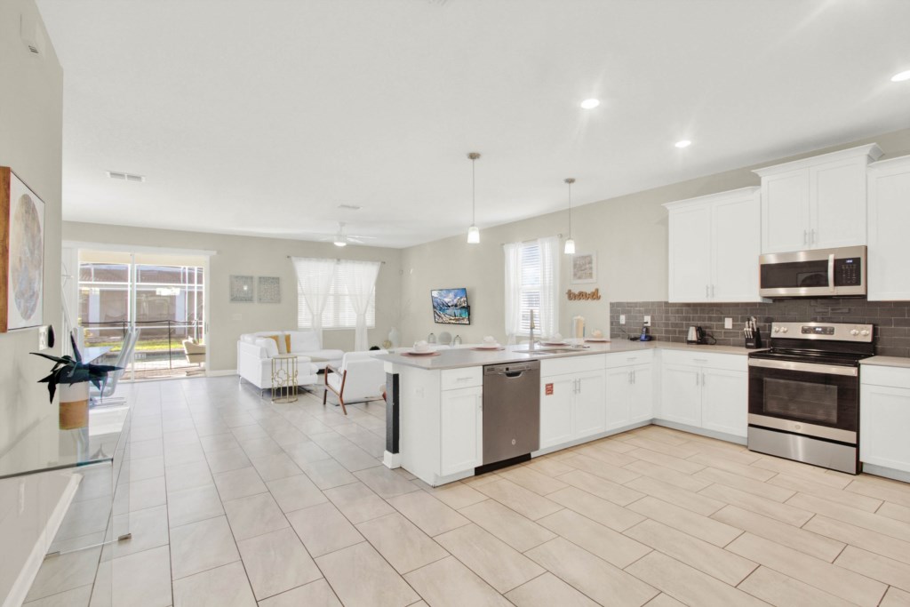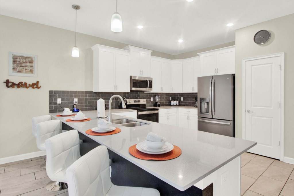Fully equipped kitchen with stainless appliances and five seat breakfast bar