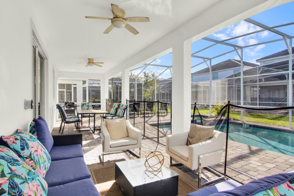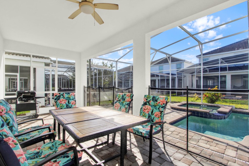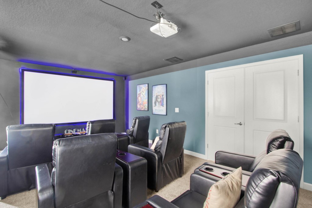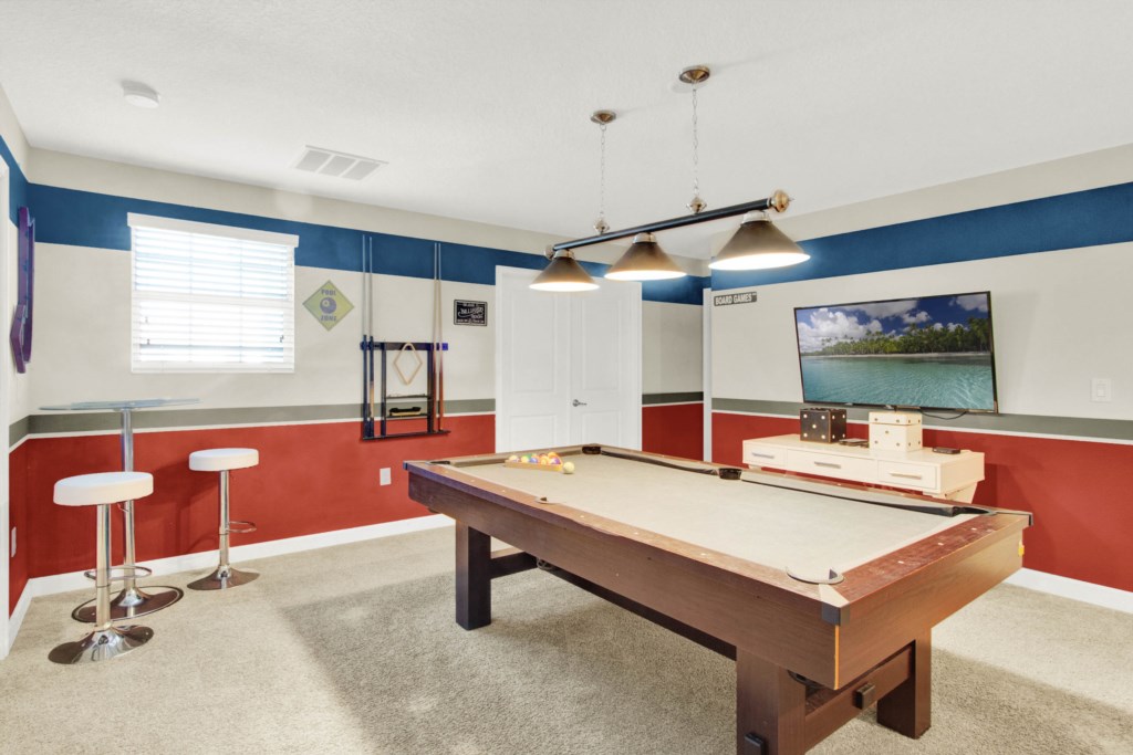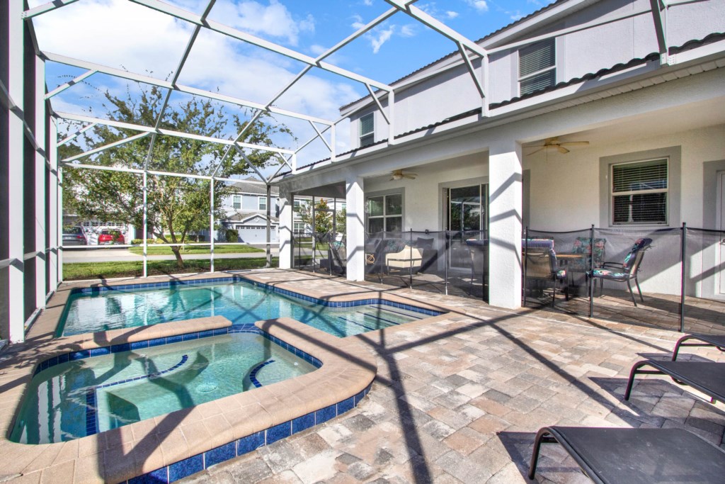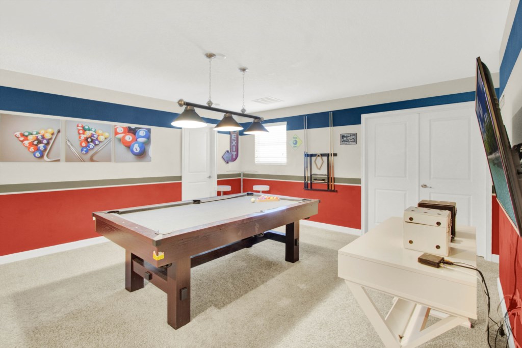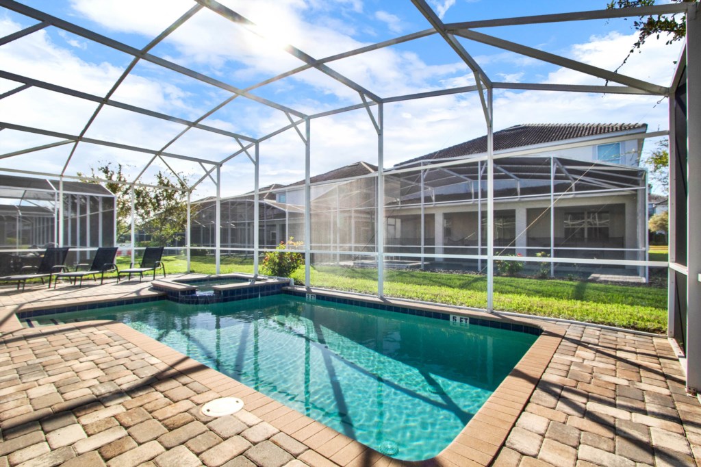 Enjoy this wonderful home on your next trip to Orlando. Perfect for multi-family party, or golf groups, this property features all the comforts of home. This spacious 8 bedroom, 5 bathroom home sleeps up to 16 in style. With 2 king bedrooms, 4 queen bedrooms and 2 twin rooms, and all have wall mounted flat screen LED TV’s. The dining room and living area offers plenty of space to congregate and enjoy meals together, and the bright and airy kitchen has all the appliances that you would expect in your own home. You can also enjoy a game of pool in the game room, or watch a movie in the home theatre, take a dip in the large pool or relax in the spa, or just relax on the south facing lanai and pool deck. Also, The Oasis Club which is a short walk, or two minute drive from the front door, has a large community pool, pool with lazy river, water slides, tiki bar, fitness centre, movie theatre, games room, and The Grill Restaurant, where you can eat in the air conditioned comfort of the Clubhouse, or pool side.