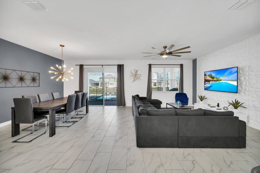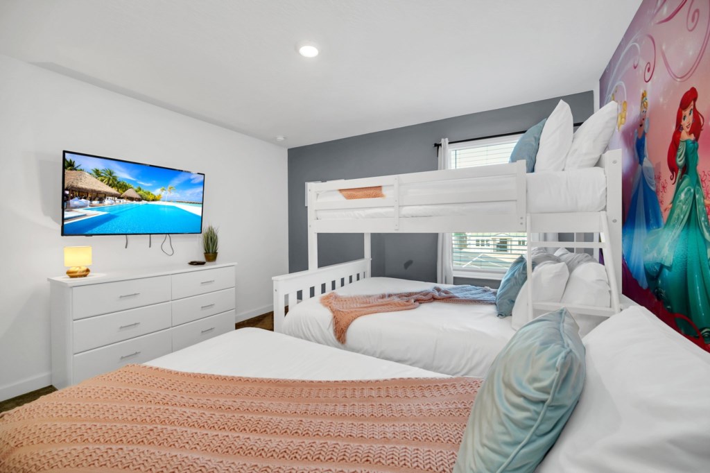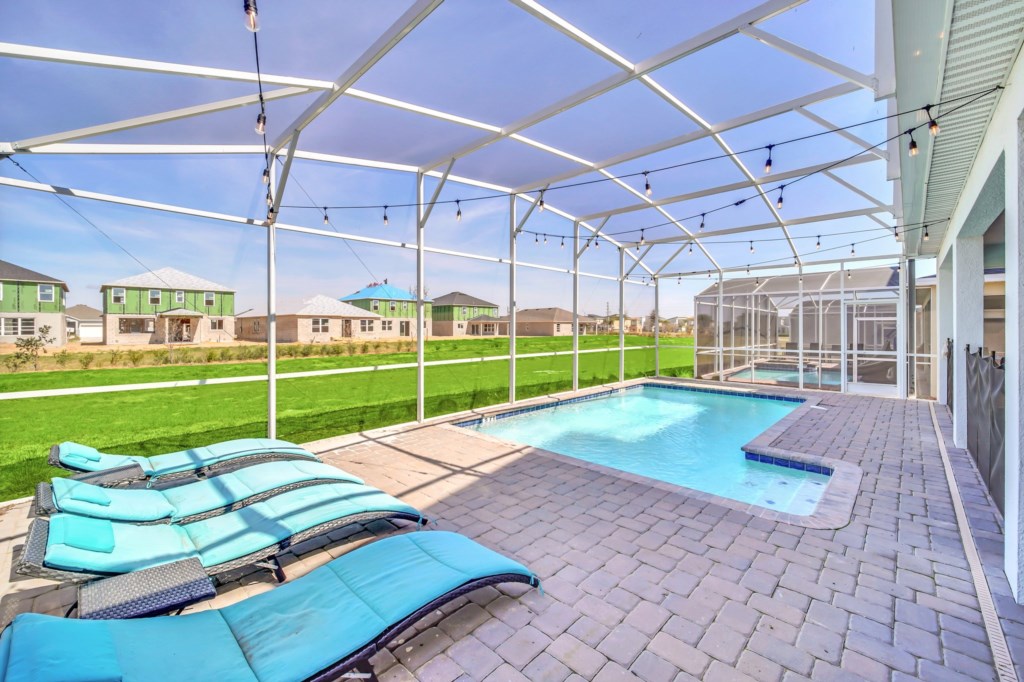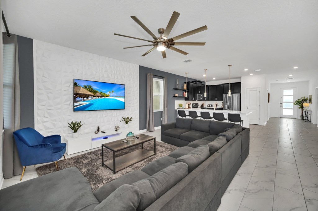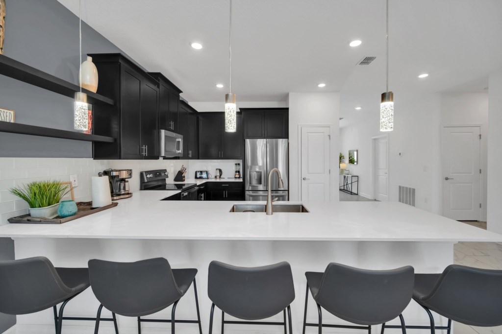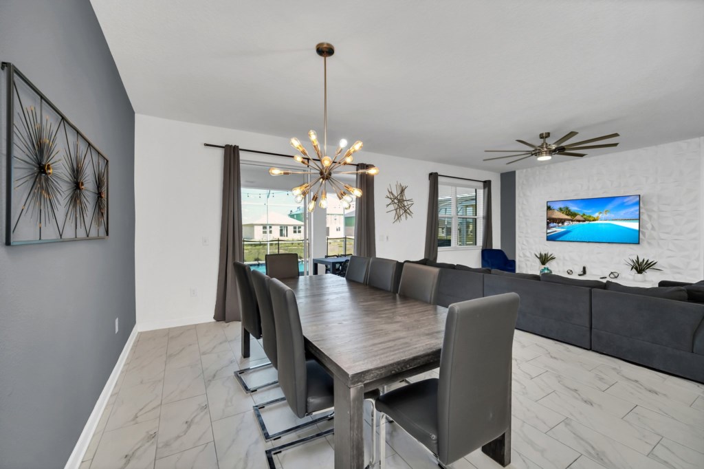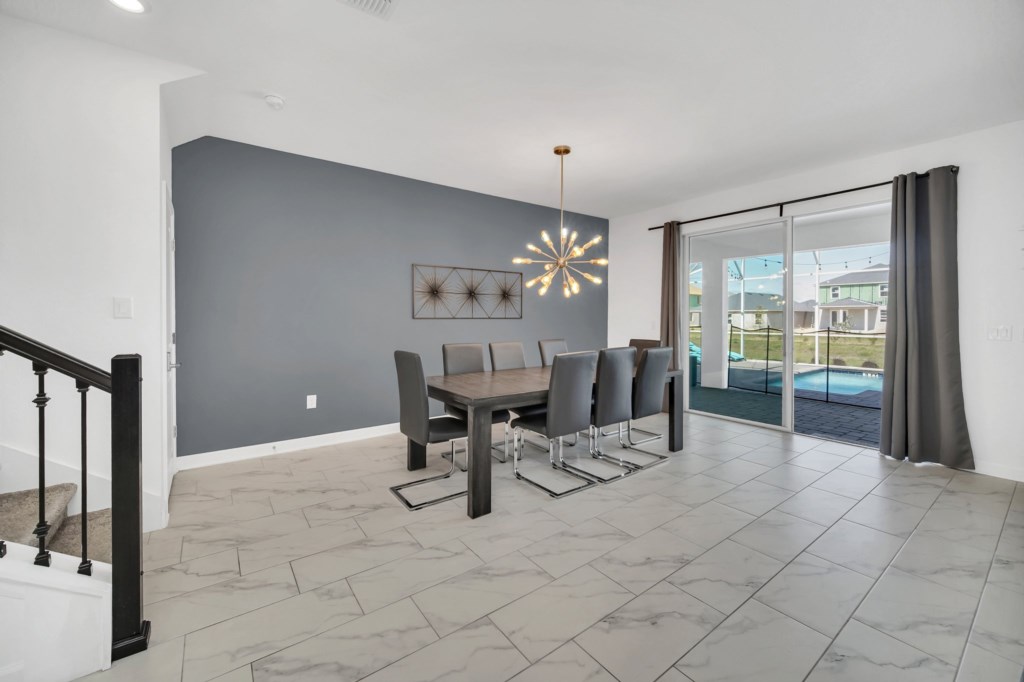 Located at the prestigious ChampionsGate Resort, this luxurious and spacious 7 bedroom, 5 bathroom villa with a large private pool, sun deck and shaded lanai has two king master ensuite bedrooms, two further king double rooms, a queen double, and two twin rooms, one with two full sized beds and the other with one twin and a full sized under twin bunk bed. A fully equipped kitchen with stainless steel appliances and granite counters allows for food preparation for the 5 seat breakfast bar, or 8 seat dining table.