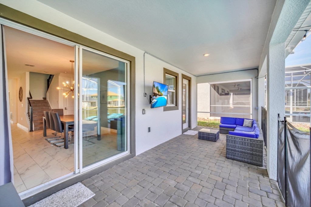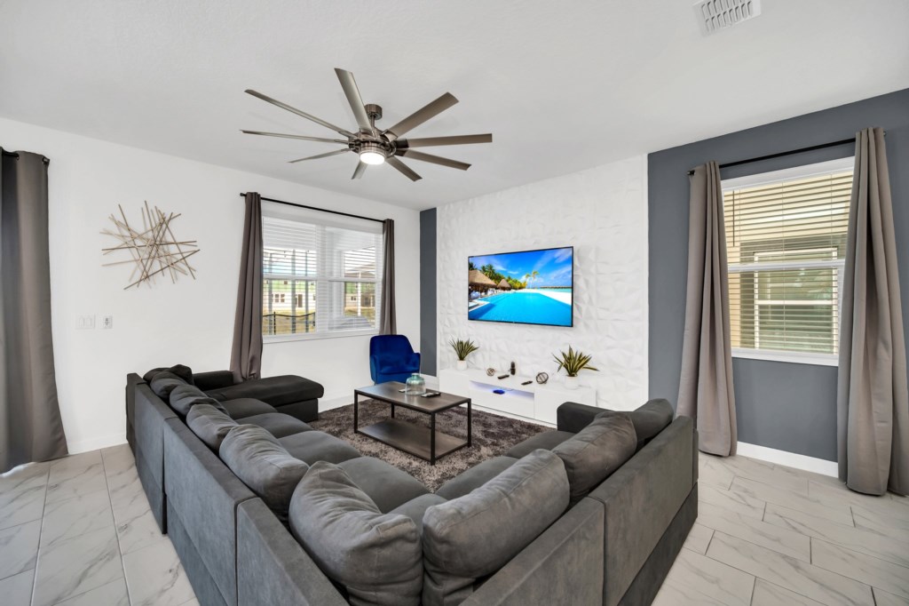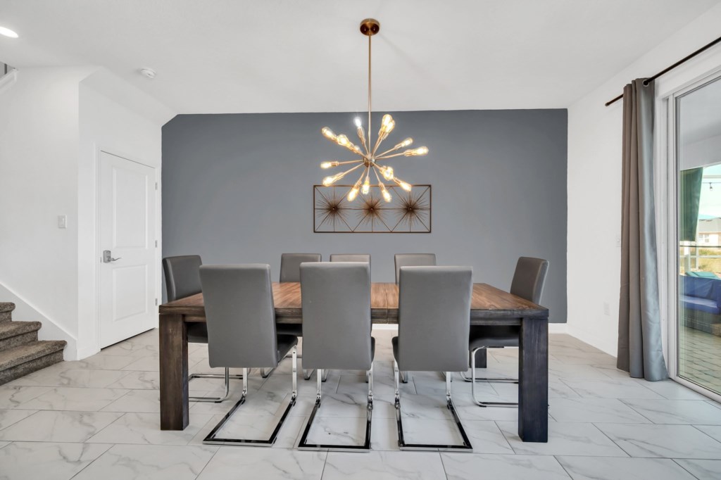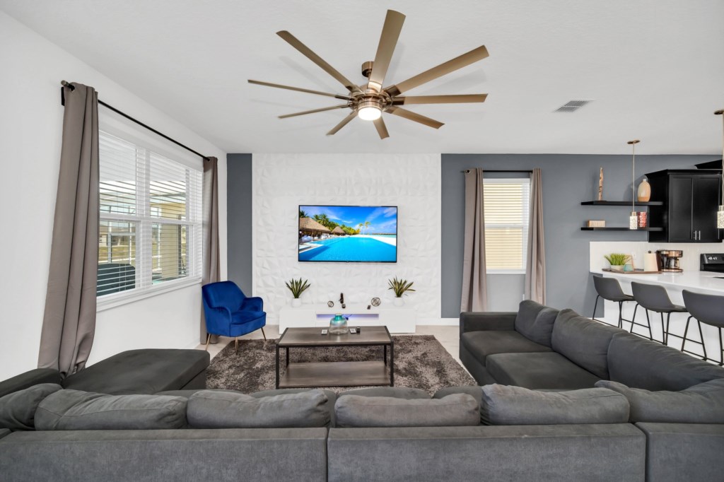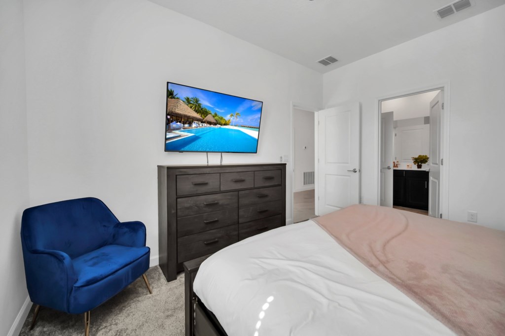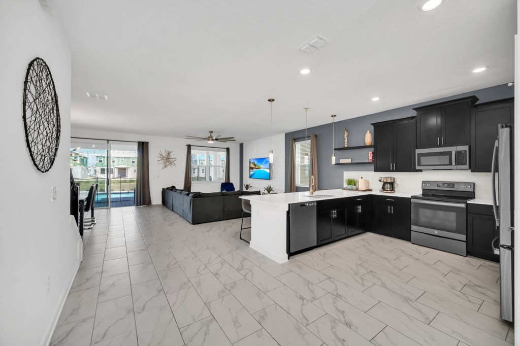 Located at the prestigious ChampionsGate Resort, this luxurious and spacious 7 bedroom, 5 bathroom villa with a large private pool, sun deck and shaded lanai has two king master ensuite bedrooms, two further king double rooms, a queen double, and two twin rooms, one with two full sized beds and the other with one twin and a full sized under twin bunk bed. A fully equipped kitchen with stainless steel appliances and granite counters allows for food preparation for the 5 seat breakfast bar, or 8 seat dining table.