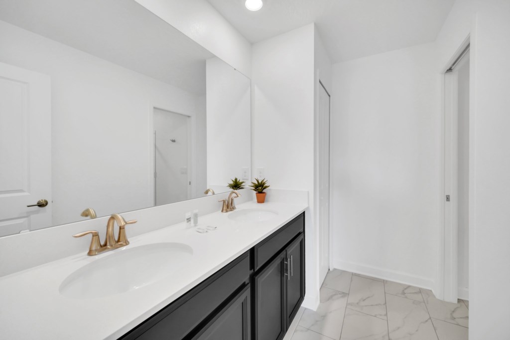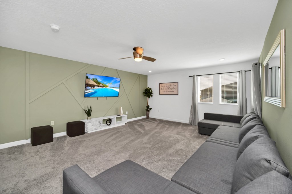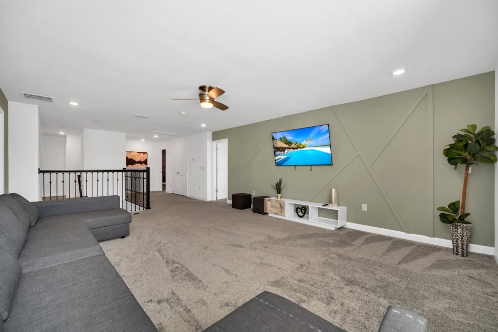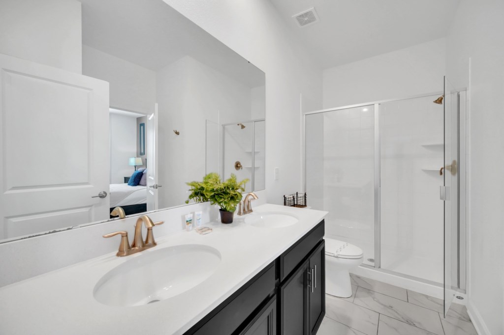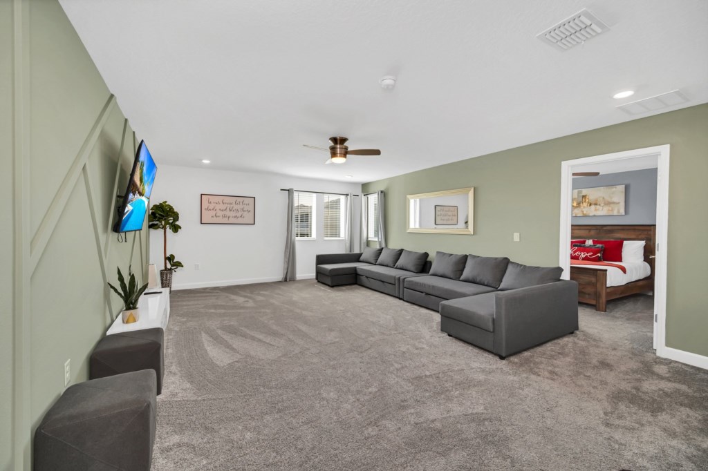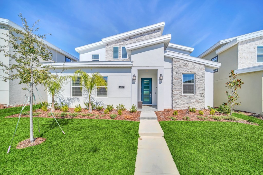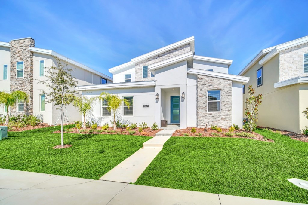 Located at the prestigious ChampionsGate Resort, this luxurious and spacious 7 bedroom, 5 bathroom villa with a large private pool, sun deck and shaded lanai has two king master ensuite bedrooms, two further king double rooms, a queen double, and two twin rooms, one with two full sized beds and the other with one twin and a full sized under twin bunk bed. A fully equipped kitchen with stainless steel appliances and granite counters allows for food preparation for the 5 seat breakfast bar, or 8 seat dining table.