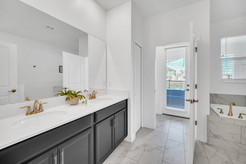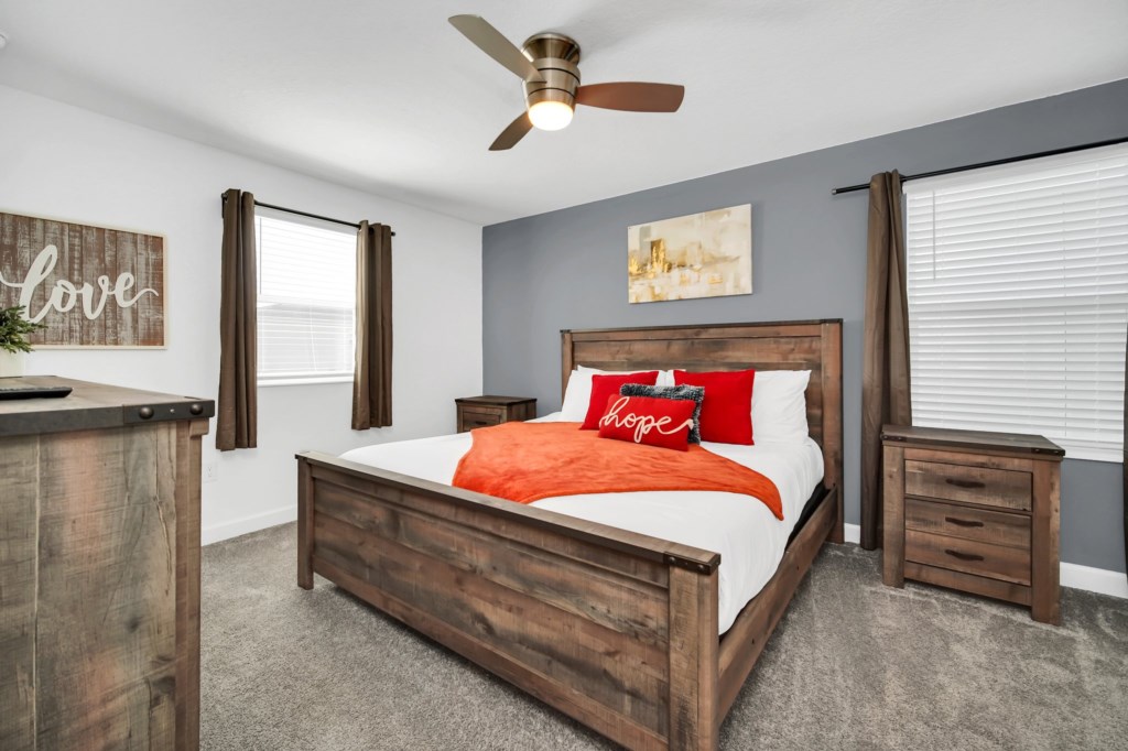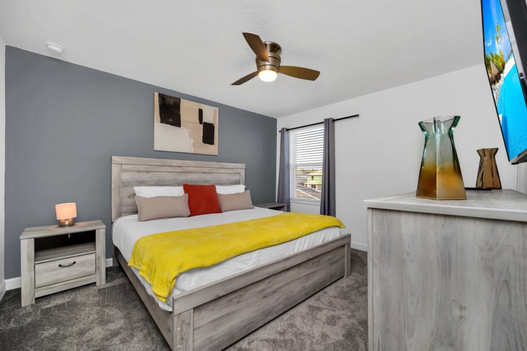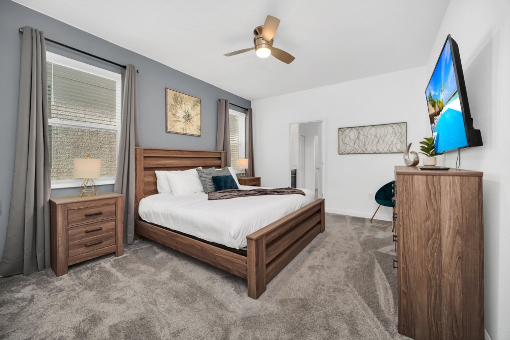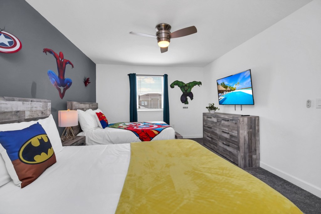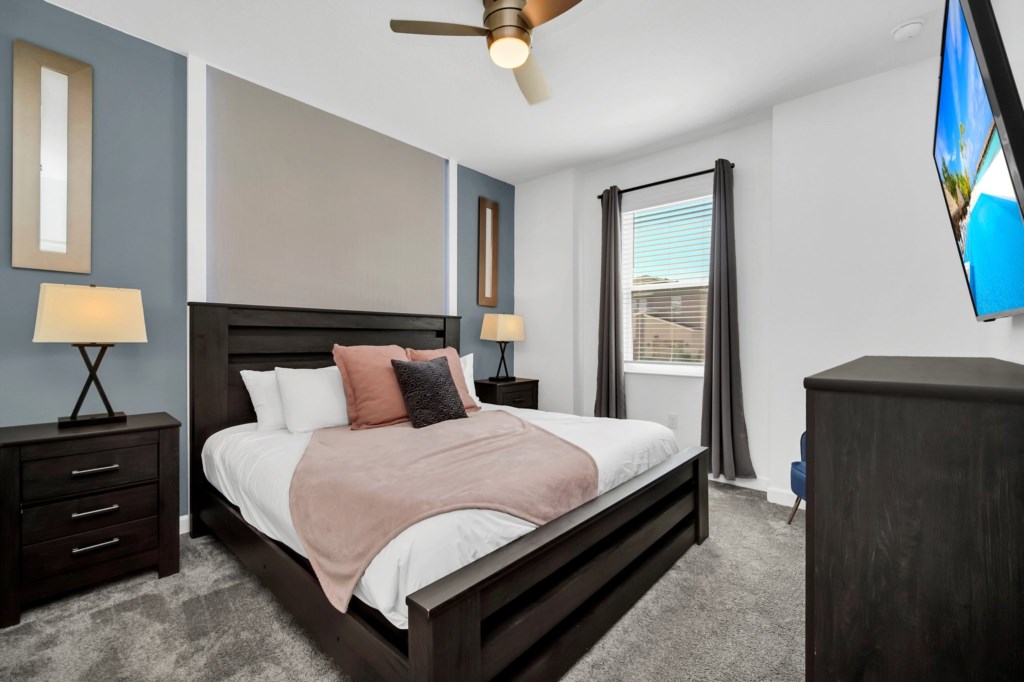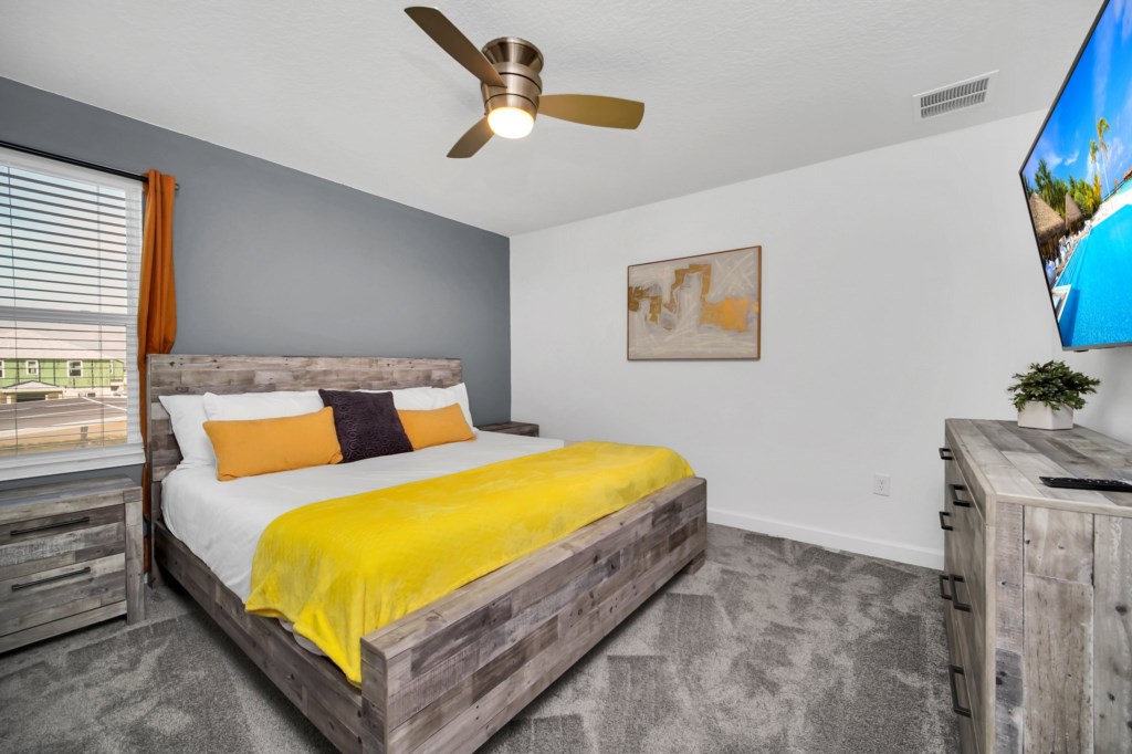 Located at the prestigious ChampionsGate Resort, this luxurious and spacious 7 bedroom, 5 bathroom villa with a large private pool, sun deck and shaded lanai has two king master ensuite bedrooms, two further king double rooms, a queen double, and two twin rooms, one with two full sized beds and the other with one twin and a full sized under twin bunk bed. A fully equipped kitchen with stainless steel appliances and granite counters allows for food preparation for the 5 seat breakfast bar, or 8 seat dining table.